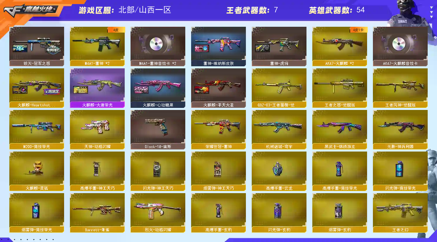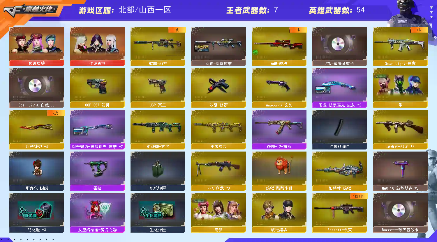 禁止开挂。;炽芒蝶刃,传说影煞,传说星骇,隼,晴雅,RPK-盘龙,M200-幻神,