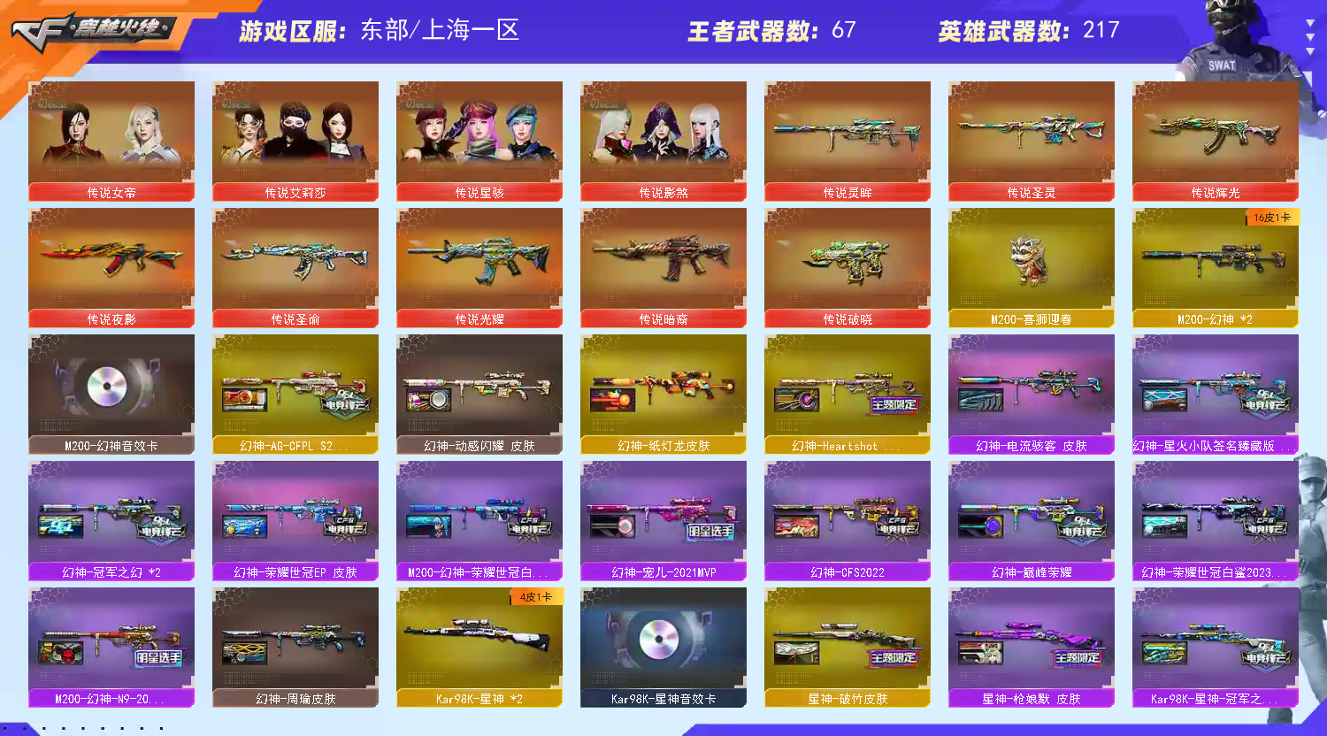13传说❤️传说女帝❤️幻神18皮❤️全音效卡❤️满配手枪❤️炼狱泡泡象+6盘+6烈蝴蝶+影煞+破晓