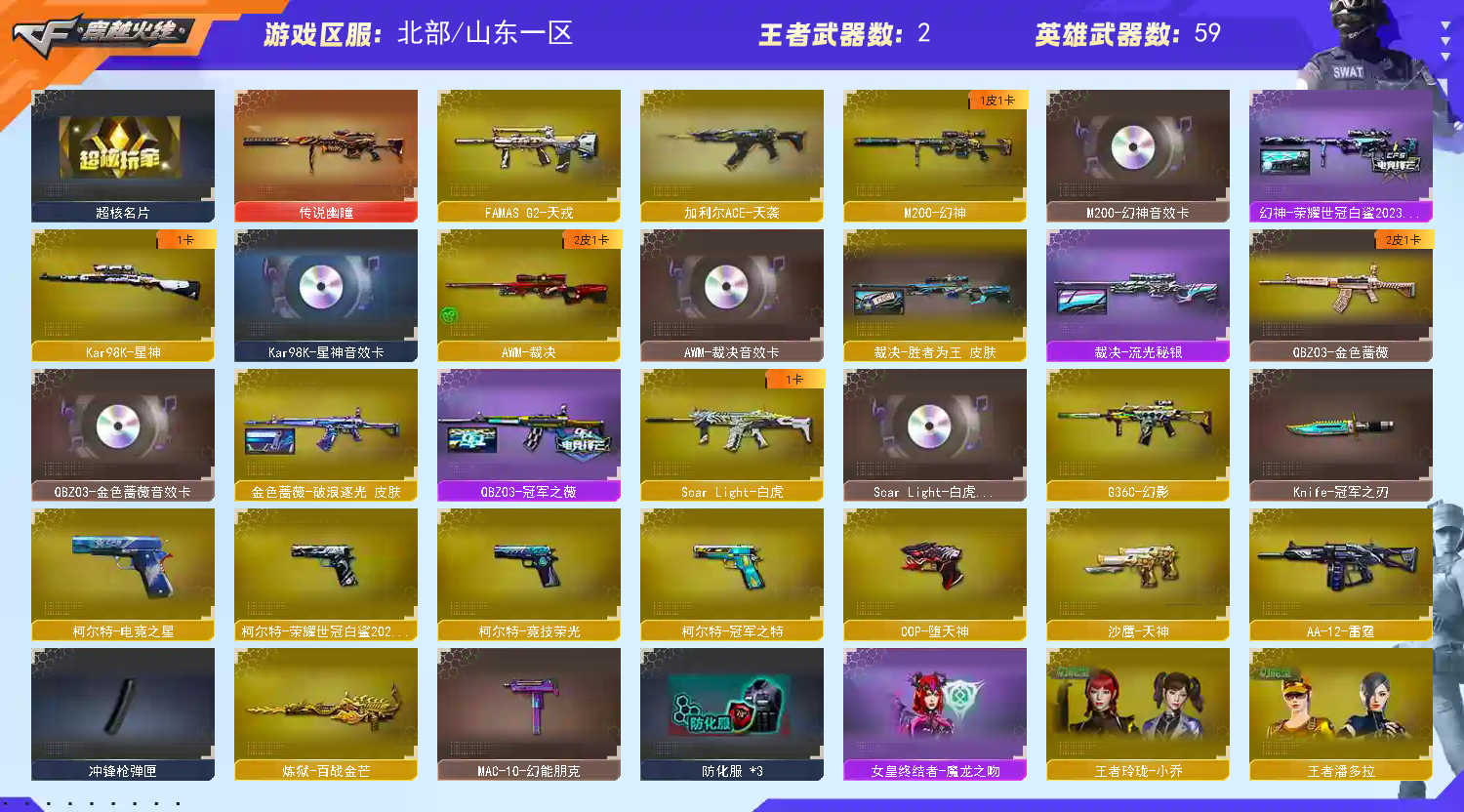 你好,租赁本账号需遵守以下规则: 1. 禁止使用鼠标宏、DMA、外挂等作弊工具,违者将被起诉索赔; 2. 订单即将结束时,禁止开启排位赛,若导致账号禁赛将被永久拉黑; 3. 有问题请填写真实理由,禁止无故撤单、恶意撤单或排位离线,违者将被拉黑 ⚠️ 特别提醒:恶意开挂导致账号封禁的,将被起诉至法院索赔。 --- ⚠️ 特别提醒:恶意开挂导致账号封禁的,将被起诉至法院索赔。 --- ⚠️ 特别提醒:恶意开挂导致账号封禁的,将被起诉至法院索赔。 ---;柯尔特-荣耀世冠白鲨2023,柯尔特-冠军之特,Knife-冠军之刃,QBZ03-金色蔷薇,传说幽瞳,G36C-幻影,M200-幻神,