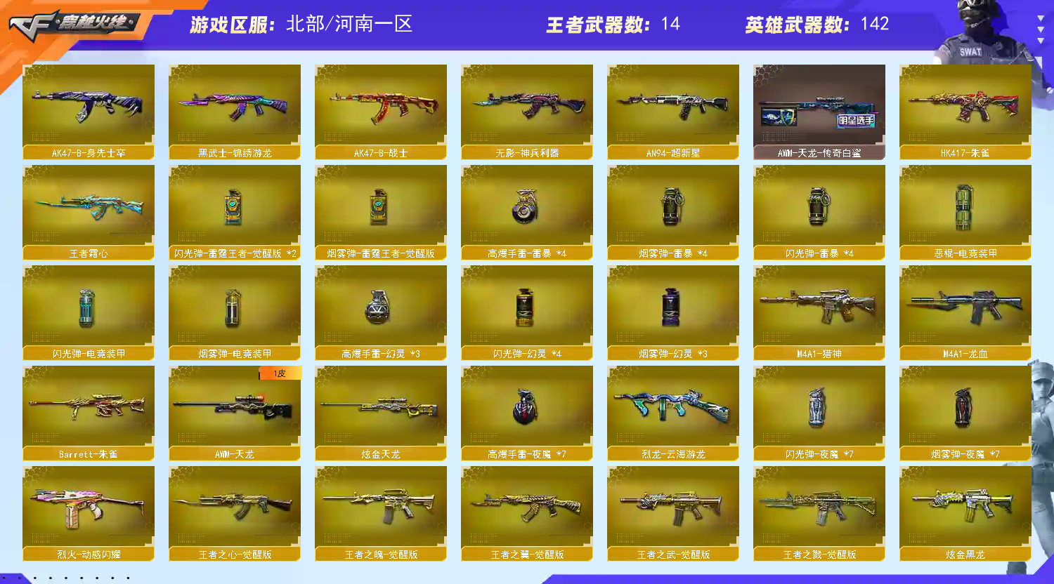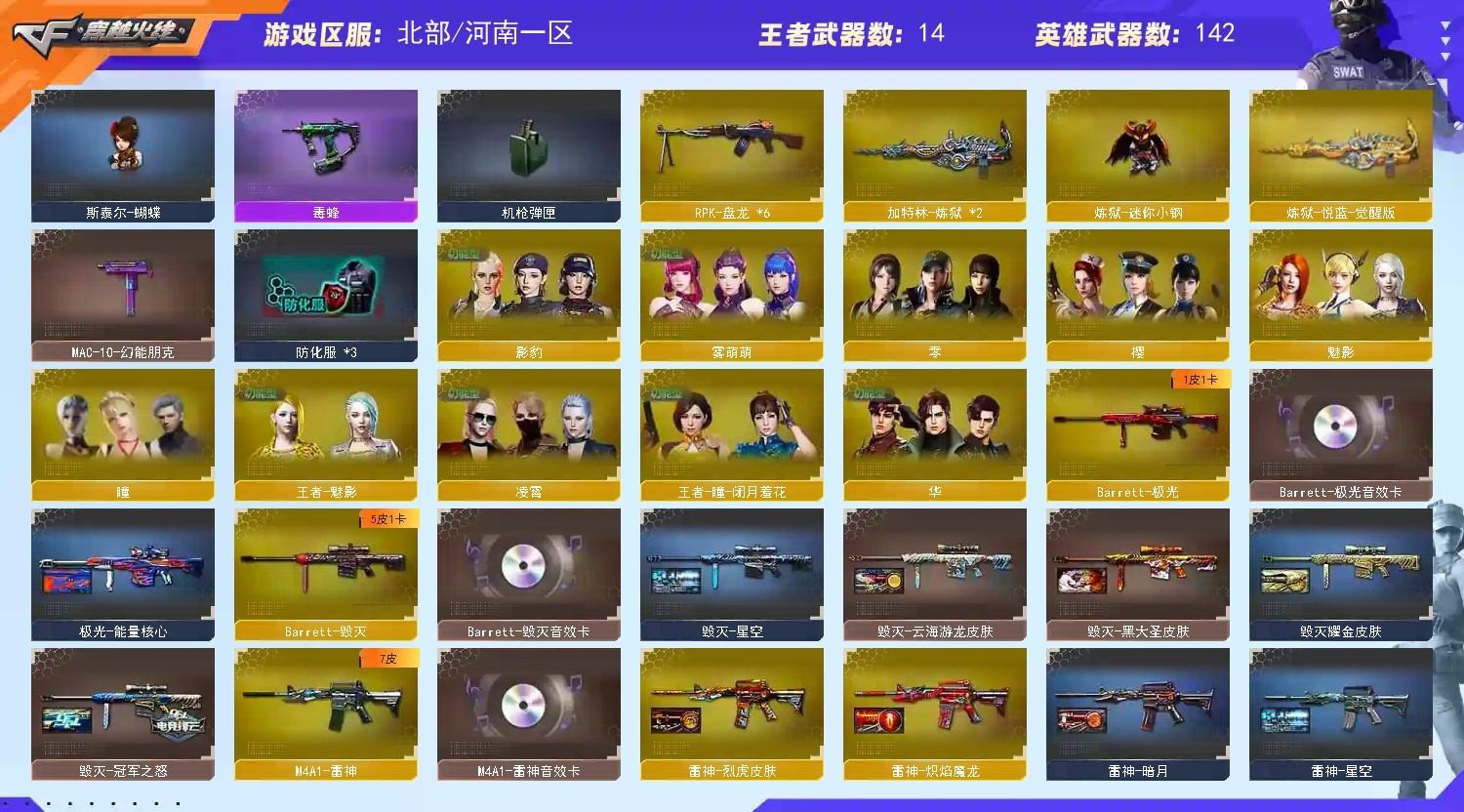 >>>>>>毁号,涉及毁坏虚拟财产罪及计算机安全罪,请文明游戏素质游戏,让我们共建美好租号平台>>>>>> 本游戏账号:英雄武器145个; 王者武器18个。 装备不多,但是主武器、副武器、近身武器够用 拥有完美游戏体验。重要的是,特殊装备有:传说梦魇、传说光耀、白虎、G36C幻影、双幻神、星神、雷暴USP两把、COP幻灵三把、七套夜魔套装、七套幻灵套装、六把盘龙、迷你小刚加特林、六把猎龙、斯泰尔蝴蝶、六把M4A1黑骑士,战场模式满级满宝石、热门武器音效卡等,随意畅选。 注意事项: A.游戏过程中请不要恶意挂机或者不文明发言 B.恶意挂机、顶号等行为将被拉黑无法再次下单 C.进入游戏后中途请勿退出登陆,否则无法再次上号 D.部分账号由于异地登录可能会出现密码错误提示,通常再尝试5-6次后可上号 |||||||||喜欢本账号请点 ☆收藏☆ 方便下次租用,谢谢光临惠顾|||||||||;USP-雷暴,荣耀世冠-柯尔特,传说女帝,RPK-盘龙,QBZ03-金色蔷薇,G36C-幻影,M200-幻神,