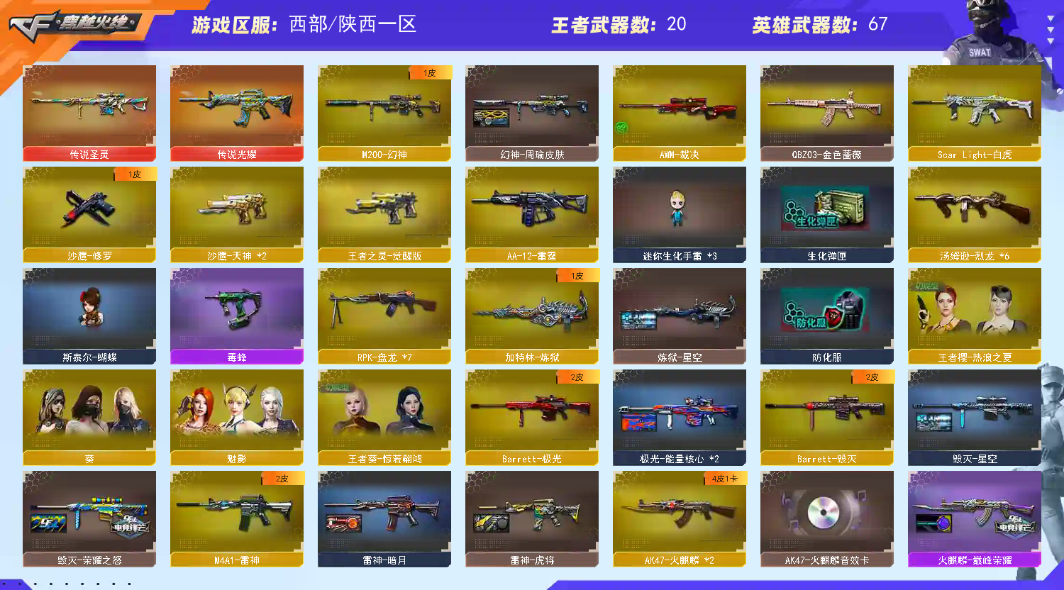斯泰尔蝴蝶换神;RPK-盘龙,QBZ03-金色蔷薇,M200-幻神,Scar Light-白虎,