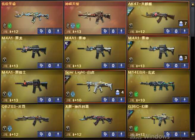 荣耀枪王✅传说圣域天绫艾丽莎神威莲华✅幻神带皮✅裁决三件套✅白虎三件套✅玄武带卡✅G36C三件套