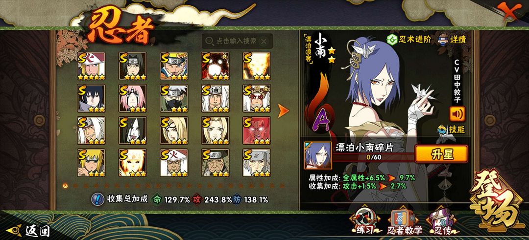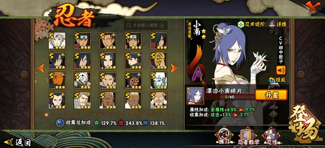 超多s,有六道带土,五影斑,金身水门,小胡子,无,漂泊盾和小南,除了活斑全高招,有熊猫