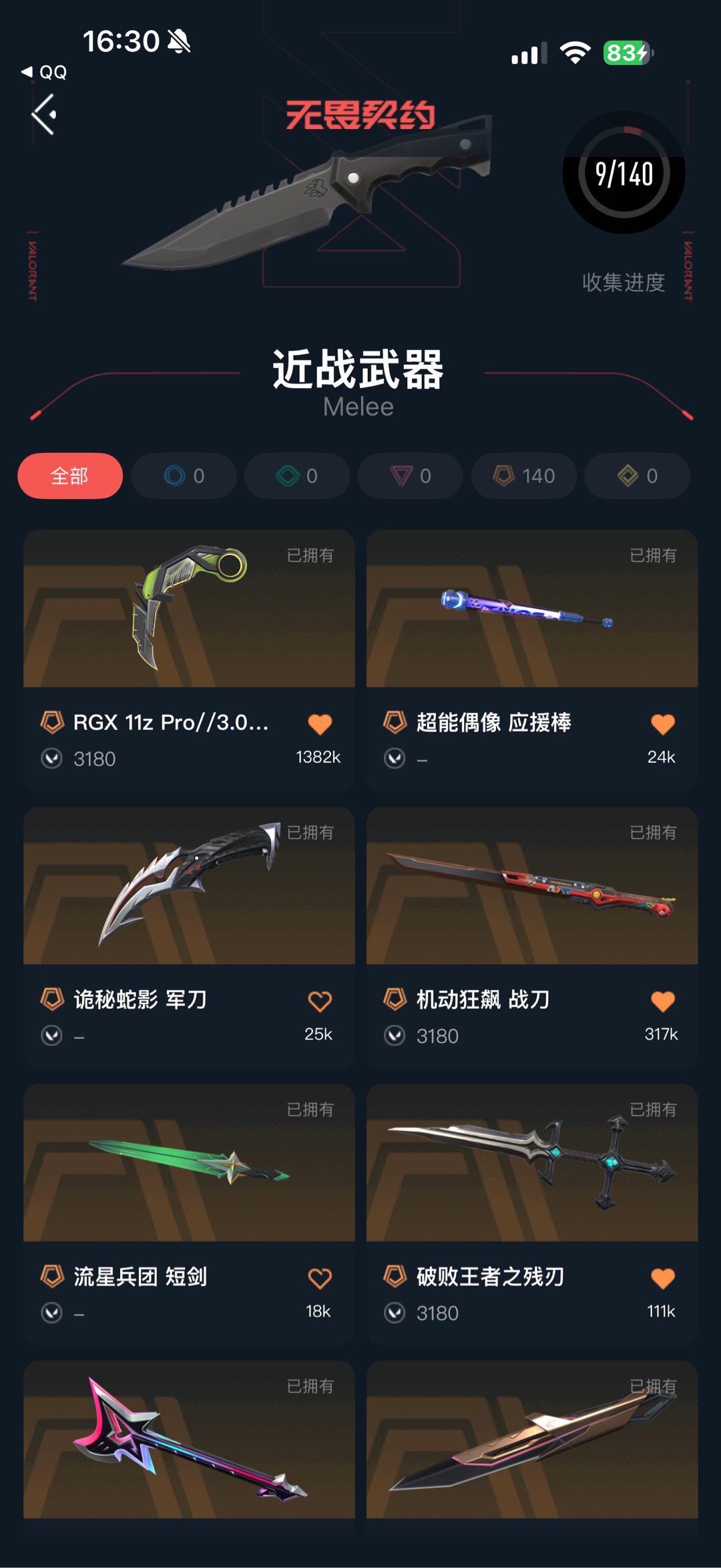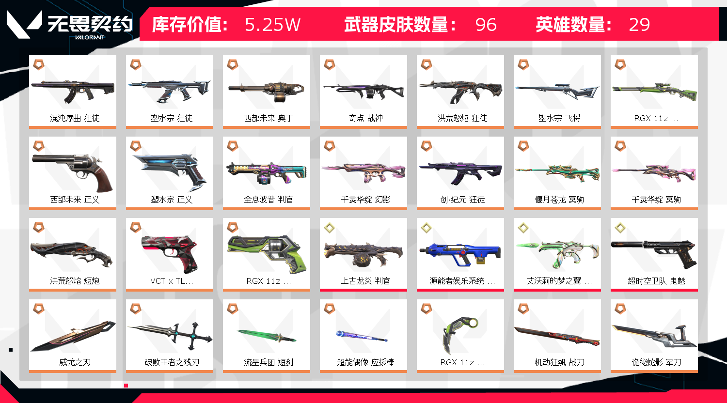 首页 > 租号大厅 > 无畏契约-wegame > wegame/wegame > 不可开挂 可排位 可语音 可打字 英雄28 武器皮肤数量96 :威龙刀,显卡爪刀,激动狂飙,破败