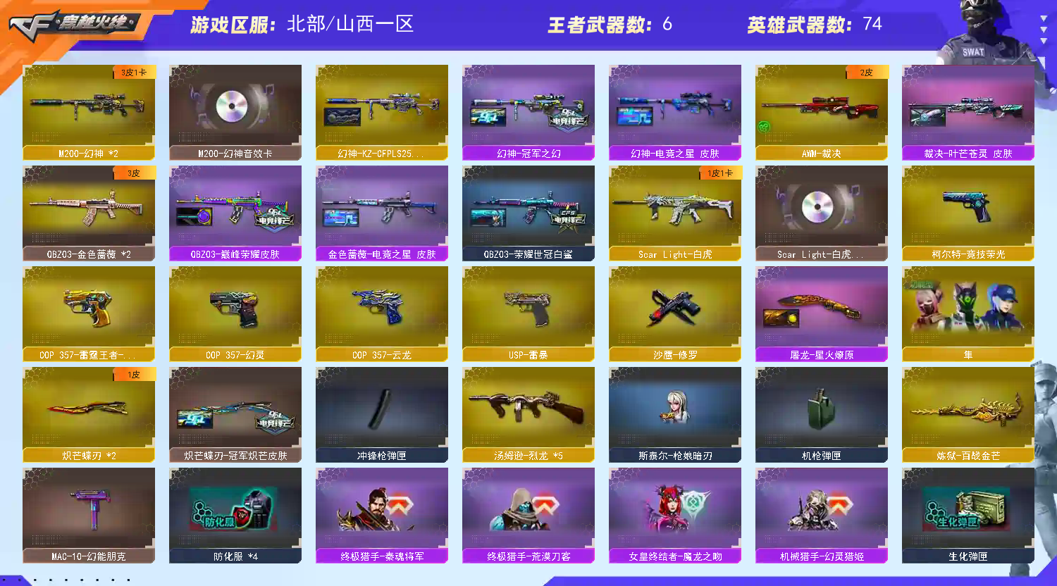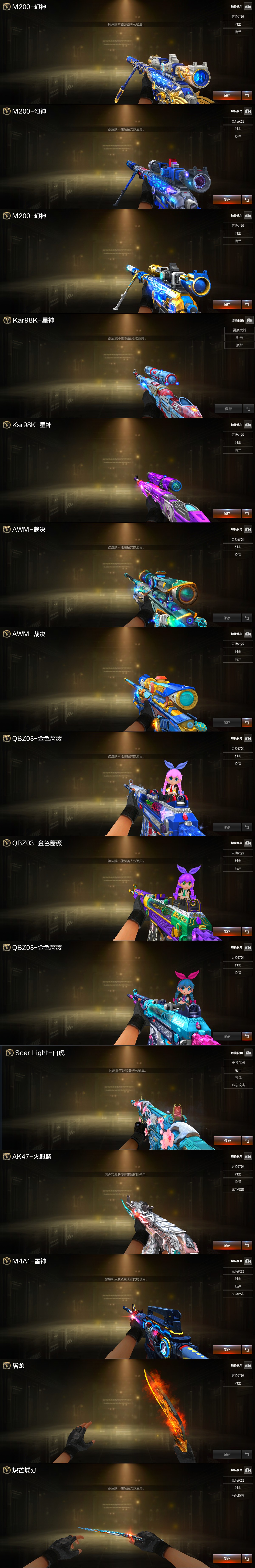 KZ幻神/幻神3皮三件套/满配5副手/裁决双皮/白虎三件套/6烈双蝴蝶双炽芒蝶刃;USP-雷暴,炽芒蝶刃,隼,电竞教官-云悠悠,QBZ03-金色蔷薇,M200-幻神,Scar Light-白虎,