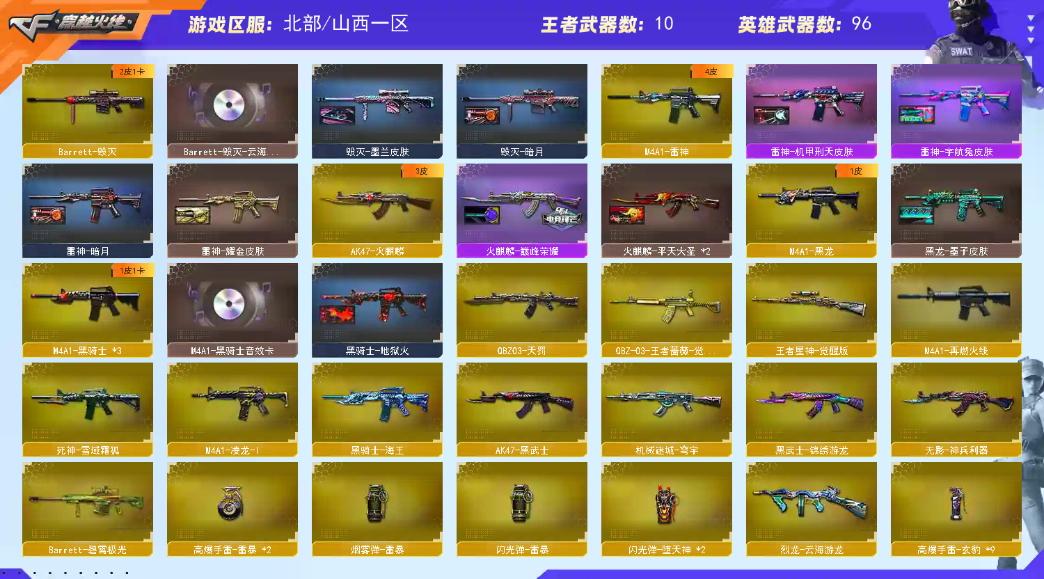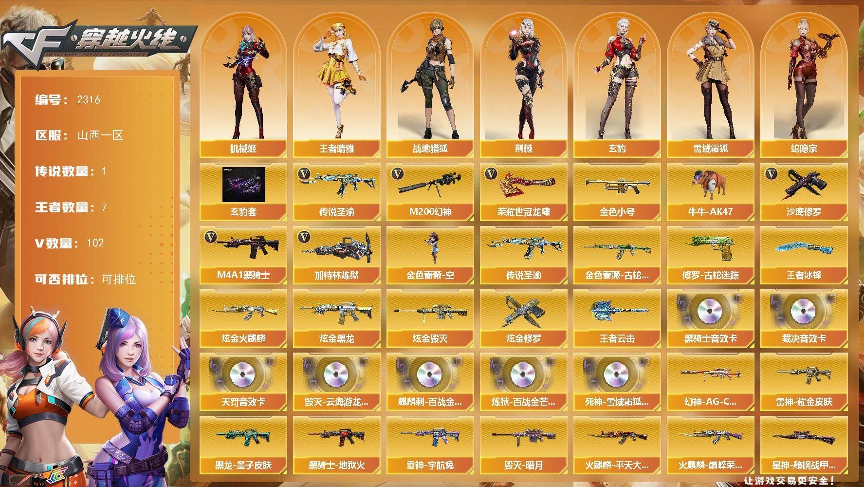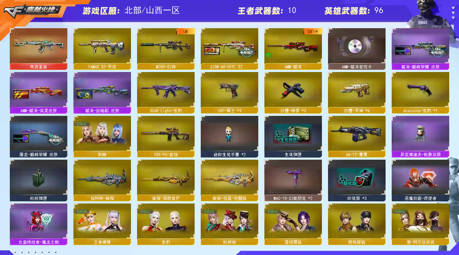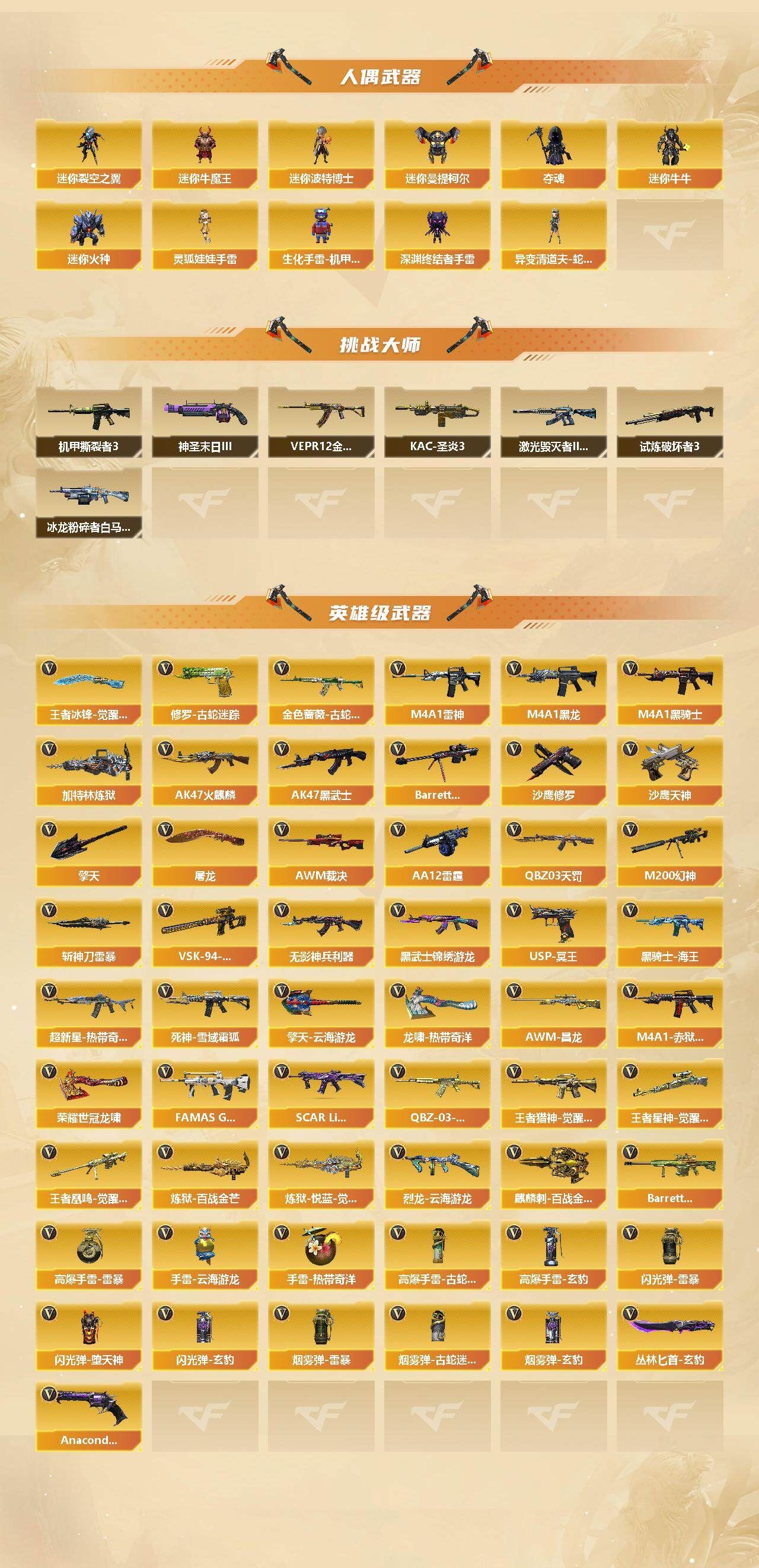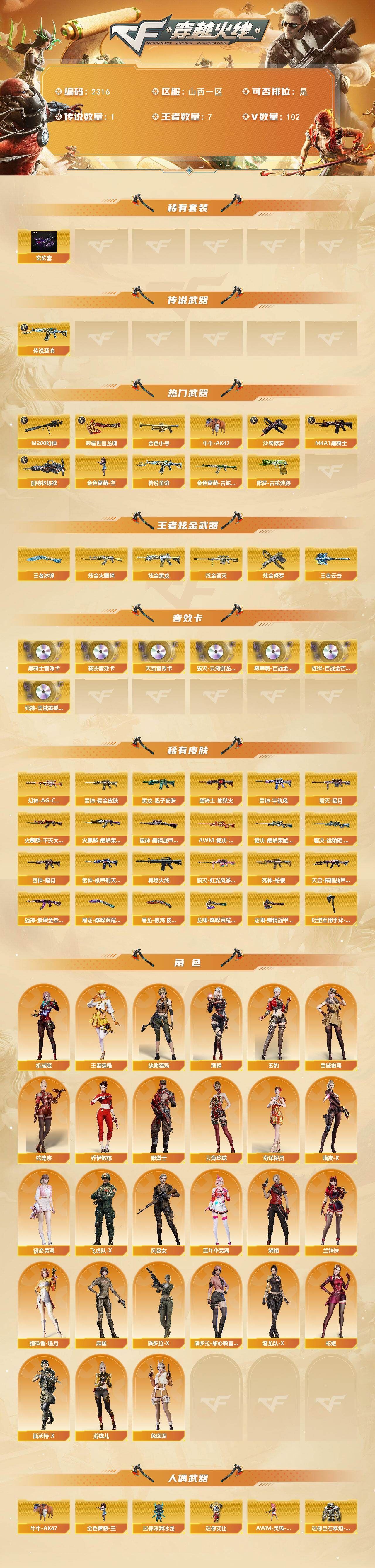 【传说武器】:传说圣谕【热门武器】:传说圣谕,M200-幻神,金色蔷薇-古蛇迷踪,修罗-古蛇迷踪,金色小号,牛牛-AK47,M4A1-黑骑士*3,加特林-炼狱,金色蔷薇-空,沙鹰-修罗*3,荣耀世冠-龙啸【稀有套装】:玄豹套【王者炫金武器】:王者云击,王者冰锋*2,炫金火麒麟,炫金黑龙,炫金毁灭,炫金修罗【音效卡】:M4A1-黑骑士音效卡,Barrett-毁灭-云海游龙音效卡,AWM-裁决音效卡,QBZ03-天罚音效卡,麒麟刺-百战金芒-盛典舞曲音效卡,炼狱-百战金芒-庆典舞曲音效卡,死神-雪域霜狐-怀旧音效卡【皮肤】:幻神-AG-CFPL S24冠军 皮肤,AWM-裁决-凤灵皮肤,裁决-巅峰荣耀 皮肤,裁决-运输船 皮肤,星神-黯钢战甲 皮肤,火麒麟-巅峰荣耀,毁灭-暗月,毁灭-虹光风暴 皮肤,黑龙-墨子皮肤,黑骑士-地狱火,屠龙-巅峰荣耀 皮肤,屠龙-惊鸿 皮肤,龙啸-巅峰荣耀 皮肤,龙啸-黯钢战甲 皮肤,轻型军用手斧-再燃火线【角色】:机械姬,四防玄豹,四防荆棘,战地猎狐,四防王者晴雅,雪域霜狐,蛇隐宗,奇洋探员,乔伊教练,修道士,云海玲珑,兔囡囡,游珑儿【人偶武器】:金色蔷薇-空,异变清道夫-蛇影双骄,AWM-灵狐-15周年嘉年华,牛牛-AK47,迷你深渊冰龙,迷你裂空之翼*3,迷你牛魔王,迷你波特博士*2,迷你曼提柯尔,夺魂,迷你牛牛,迷你火种,生化手雷-机甲核心,深渊终结者手雷,迷你艾比,迷你巨石泰坦-魔花研究所,灵狐娃娃手雷*2【挑战大师】:冰龙粉碎者-白马银枪,激光毁灭者III-白马银枪,VEPR-12-金魔,机甲撕裂者III,试炼破坏者III,KAC-圣炎切割者III,神圣爆裂者-末日III【英雄级武器】:AK47-火麒麟,M4A1-黑龙,M4A1-雷神,M4A1-黑骑士*3,AK47-黑武士,QBZ03-天罚,无影-神兵利器,黑武士-锦绣游龙,超新星-热带奇洋*2,金色蔷薇-古蛇迷踪,FAMAS G2-天戎,死神-雪域霜狐,SCAR Light-玄豹,黑骑士-海王,QBZ-03-王者蔷薇-觉醒版,王者猎神-觉醒版,Barrett-毁灭,AWM-裁决,M200-幻神,VSK-94-金蚀,王者星神-觉醒版,王者凰鸣-觉醒版,加特林-炼狱,炼狱-百战金芒,炼狱-悦蓝-觉醒版,烈龙-云海游龙,AA-12-雷霆,沙鹰-修罗*3,沙鹰-天神*6,Anaconda-玄豹*2,USP-冥王*3,修罗-古蛇迷踪,屠龙,擎天*3,擎天-云海游龙,龙啸-热带奇洋,荣耀世冠-龙啸,斩神刀-雷暴,麒麟刺-百战金芒,丛林匕首-玄豹*2,王者冰锋-觉醒版,【道具】:BS战队炫彩背包,CFS限定背包,云山科技背包,云海游龙炫彩背包,亚洲杯纪念炫彩背包,全能枪王背包,古蛇迷踪炫彩背包,奇洋探员-海龟背包,次元之矛-黄金背包,热带奇洋炫彩背包,百战金芒炫彩背包,超级背包,雪域霜狐炫彩背包,女皇终结者-魔龙之吻,救世主-黑桃战神,绿色巨人,灵魂忍者*3,迷雾幽灵*2,生化弹匣,夺命之镰,防化服*3,金色流光-枪王排位*2,星辰流光-枪王排位,巅峰赛先锋-金色流光,流光-鎏金之域,流光-再燃火线,枪王排位28赛季金色流光,枪王排位29赛季金色流光,语音特效-盛典烟火,语音特效-怀旧,语音特效-机器人,语音特效-热带奇洋,古蛇迷踪特效,雪域霜狐表情,蛇隐宗表情,萌萌小葵表情,热带奇洋表情,云海游龙表情,CFPL选手表情-第1套,EP战队名片,EP战队喷图,EP战队击杀图标,防弹头盔*5,防弹衣*6,C4工具钳*6,手雷包*6,;M200-幻神,传说圣谕,