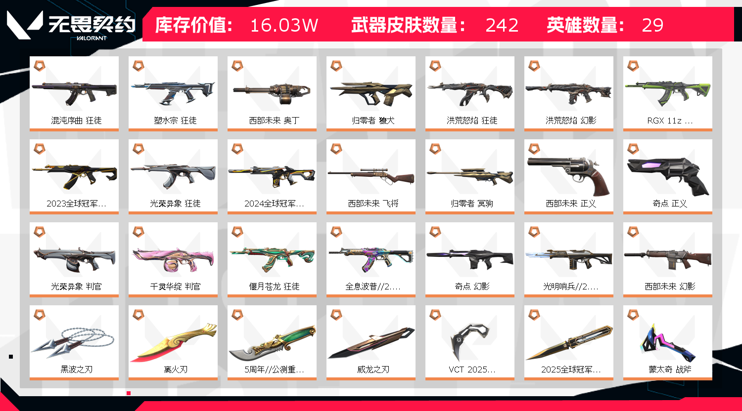 首页 > 租号大厅 > 无畏契约-wegame > wegame/wegame > 18万库230皮30刀皮190枪皮14套装 2324冠军套装奇点2.0般若假面2.0耀鳞威龙套