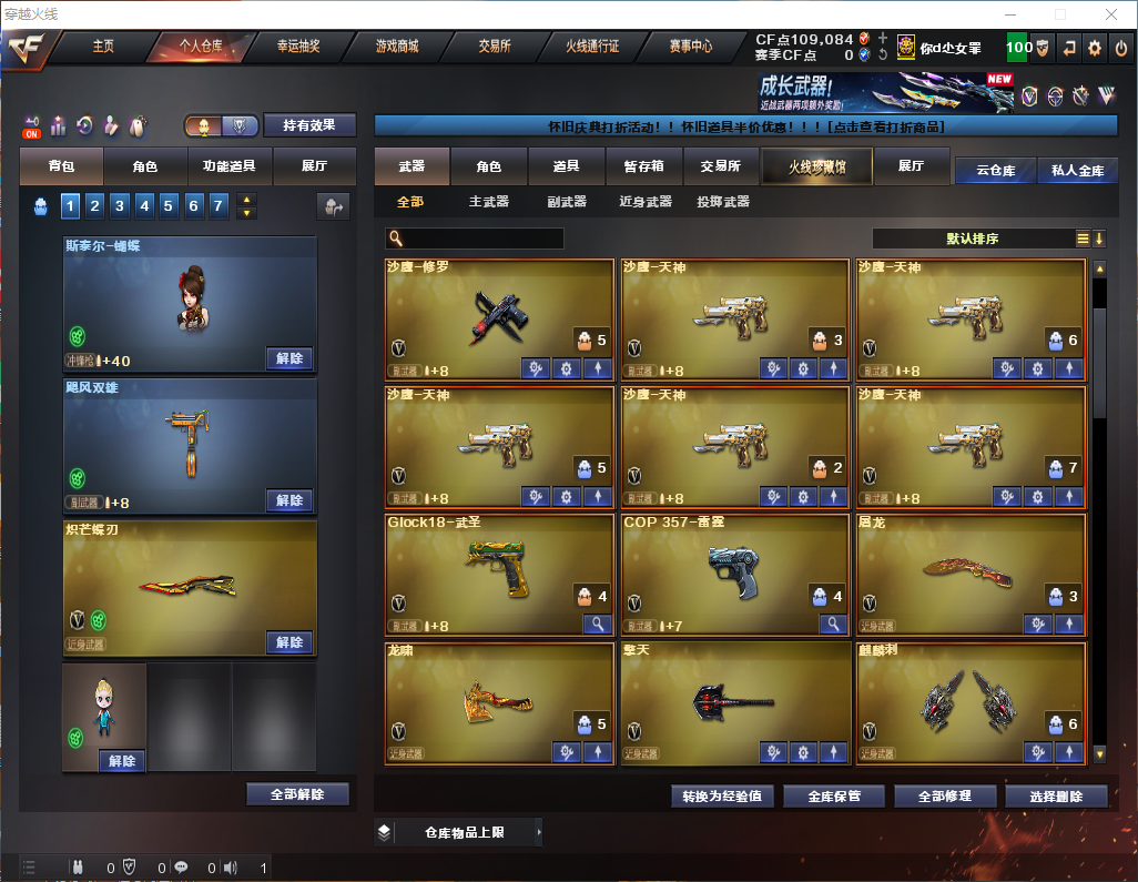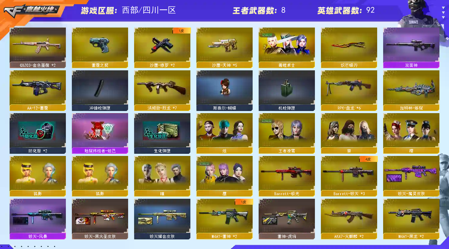 【主武器】斯太尔蝴蝶/炼狱/⑥烈龙⑥盘龙/异变镇魔者/王者青龙觉醒版/2火麒麟/2黑龙/2雷神/黑骑士/2死神/超新星/武圣/机械迷城/2黑鲨/M4雷霆/朱雀/玫瑰精灵/2蔷薇qbz/烈火/王者之魄觉醒版/王者之武觉醒版/猩红传说/天龙/3毁灭/极光/雷霆大炮/暗月传说大炮/AA12雷霆/王者之翼/王者青龙/M37-葵 【副武器}】飓风双雄/COP357-雷霆/2修罗/5天神/武圣手枪/炫金天神/ 【近身武器】炽芒蝶刃/屠龙/7麒麟刺/龙啸/擎天/尼泊尔雷霆/迷你宝贝/王者玉峰/手斧镜 【投掷武器】迷你生化手雷/⑦高爆手雷雷霆+⑦烟闪/ 【角色】毒蝰术士+四防/鹰/瞳/樱/炫/王者凌霄/狐影/修道士/灵狐者黄金海岸/零水下丽影/葵/对讲机/炫彩背包/4戒指 【皮肤】雷神-虎将皮肤/毁灭-耀金皮肤 【音效卡】0 【道具】紫金大元首/全背包/VIP/AC/烟雾头/伪装幽灵/变异宝贝/灵魂忍者/迷雾幽灵/灵魂忍者/勇往直前包/全弹夹/圣泉猎手-炽雪皮肤/地狱终结者妲己皮肤/生化爆破全装;炽芒蝶刃,RPK-盘龙,QBZ03-金色蔷薇,