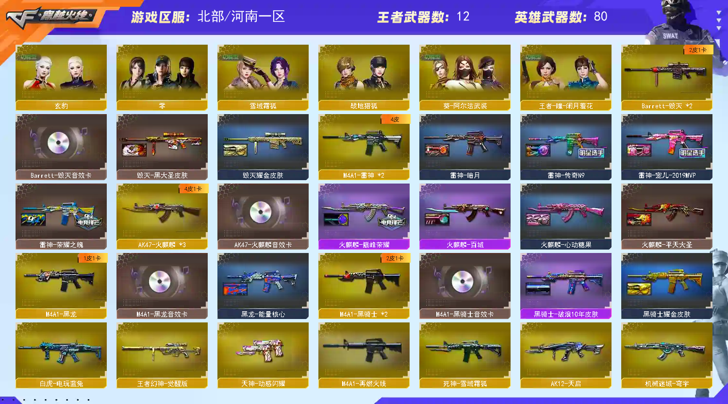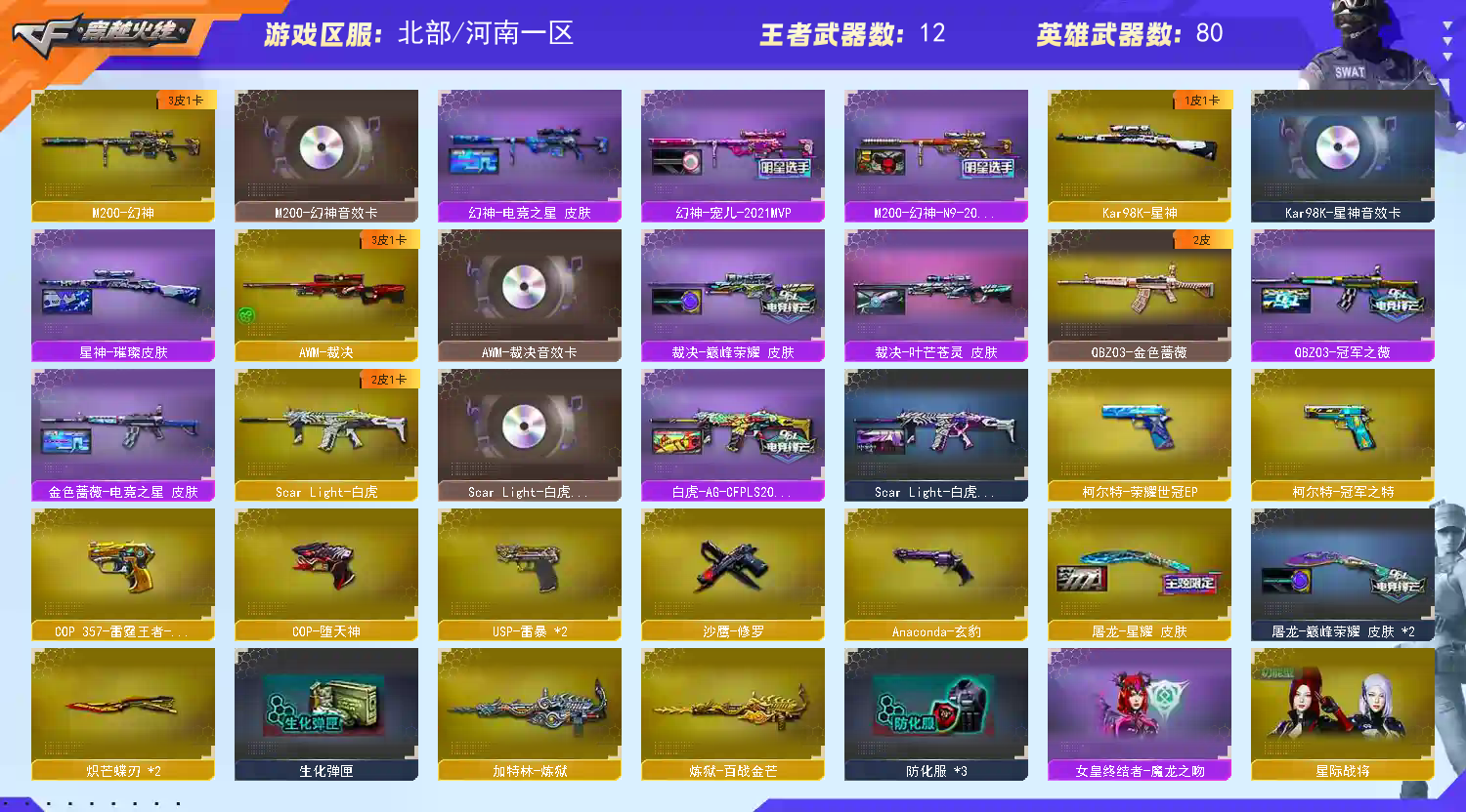 角色只有4防玄豹|副武器冠军之特 荣耀世冠ep |cop两个 雷暴两个|非英雄级柯尔特1911-cfs;USP-雷暴,柯尔特-冠军之特,炽芒蝶刃,QBZ03-金色蔷薇,M200-幻神,Scar Light-白虎,Kar98K-星神,