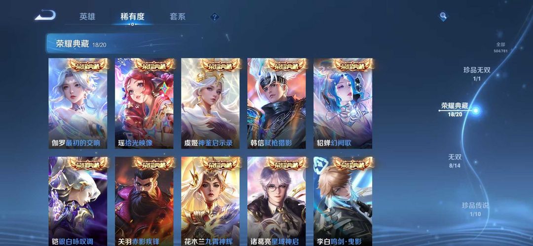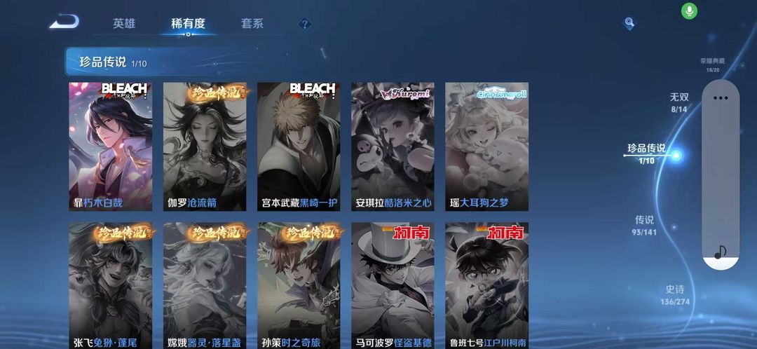 v10、12水562皮、死亡执政官、刘备星传说时之思念、小兵皮肤大耳狗甜茶、瑶无双真我赫兹、愿照·九州拓、怪盗基德、画中仙、至尊宝、凤求凰、神威、天魔缭乱