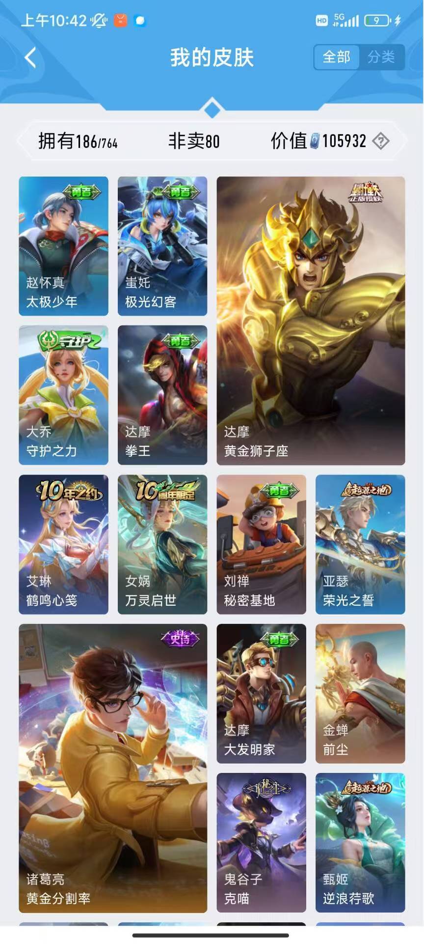女生号 贵10 多皮肤多传说 别拿那些空号v10来比 要看性价比 貂蝉武则天夏侯惇孙悟空李白鲁班小乔荣耀水晶 妲己九尾无双皮肤 80个传说 473皮肤
