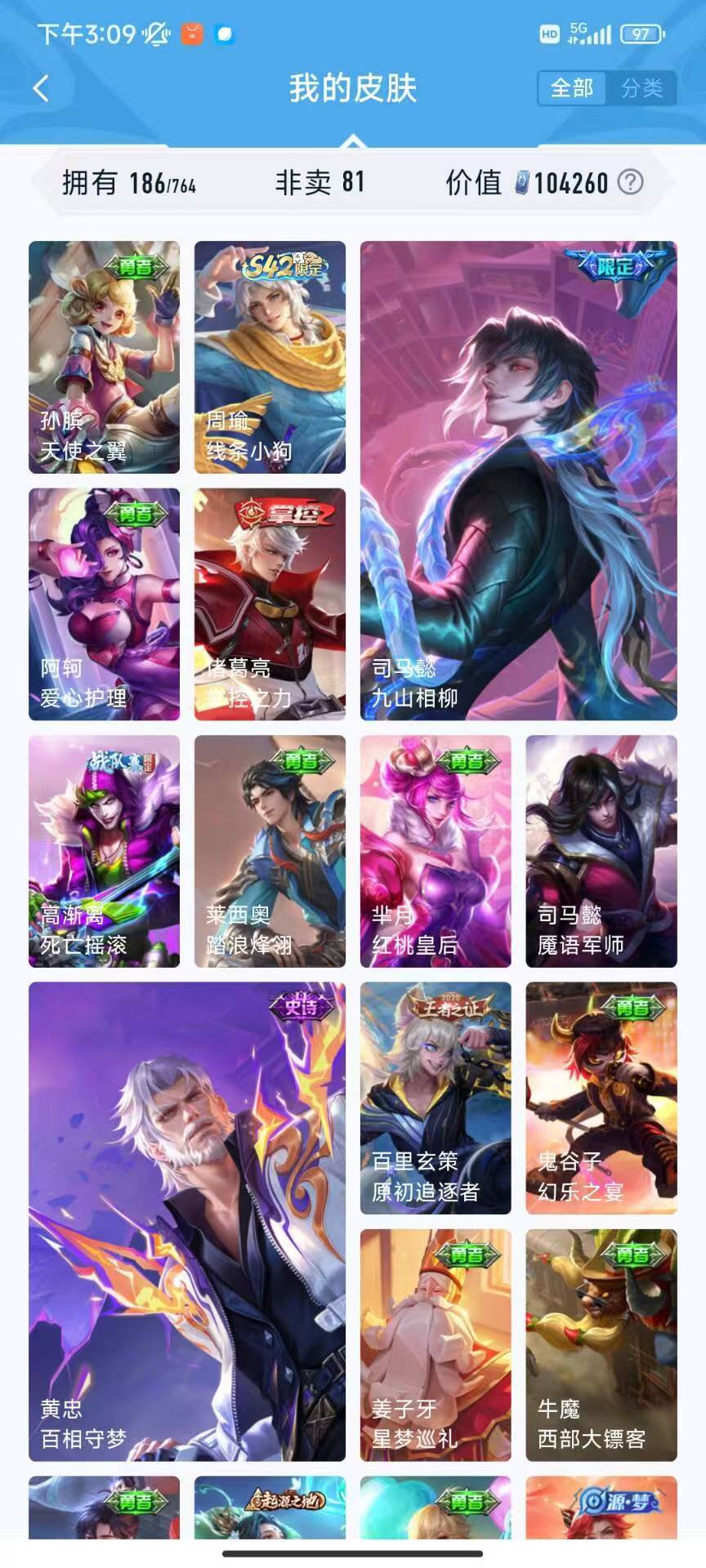 v10、537皮6水4无双、安琪拉-颠倒童话·魔镜、朵莉亚-神骥、遇见神鼓、齐天大圣、白虎志、韩信荣耀典藏、73传说、时之魔女、瑶无双、青丘、九尾、神器明辉仪