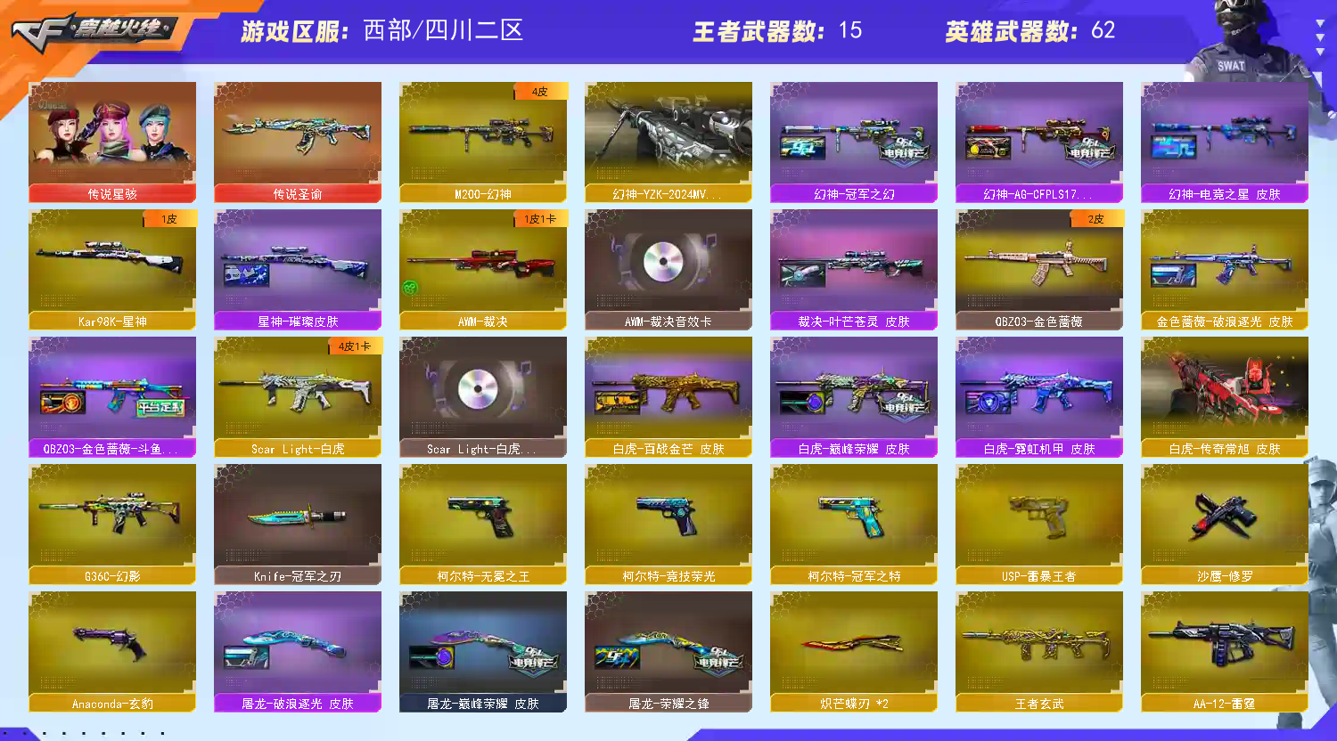 首页 > 租号大厅 > 穿越火线 > 电信区/四川二区 > 喜欢收藏爆破号,幻神四皮,白虎三件套带四皮,98k带皮,裁决三件套,雷神荣耀之魄,冠军之刃,蝴蝶刀
