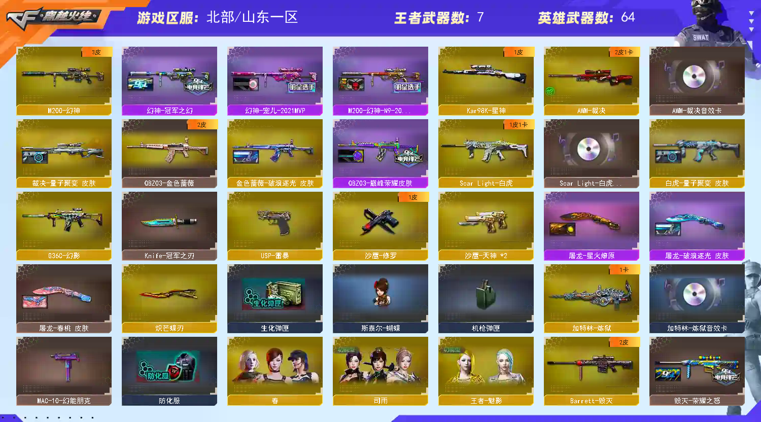 【m200幻神+冠军之幻+宠儿+n9皮肤+usp雷暴+冠军之刃】【98k星神+拼搏】【g36c幻影】【scar白虎+量子聚变】【qbz金色蔷薇+巅峰荣耀】【朱雀】【火麒麟】【雷神+s18冠军+宠儿+荣耀之魄】【黑骑士+卡】【毁灭+ag15冠军+荣耀之怒】【裁决 +裁决音效卡+量子聚变】【炽芒蝶刃】【炼狱+卡】【雷暴套 】【武器:雷暴 天罚 王者之武 王者火魄 海王 炼狱】【6手枪:修罗 天神*2 雷暴 王者之魂 】【10刀具:屠龙*2 龙啸 麒麟刺 斩神刀雷暴 扳手】【8雷套:雷暴雷*7 幻灵雷】【小人枪:斯太尔蝴蝶 】【音效卡:炼狱音效卡 白虎音效卡 裁决音效卡 黑骑士音效卡 】【四防角色:王者魅影 】;USP-雷暴,炽芒蝶刃,Knife-冠军之刃,QBZ03-金色蔷薇,G36C-幻影,M200-幻神,Scar Light-白虎,