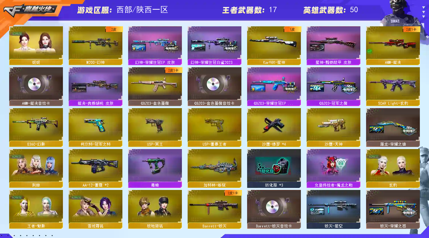 亮点解析 裁决三件套 武器齐全】【m200幻神+荣耀世冠ep+荣耀世冠白鲨2023+冠军之特】【98k星神+黯钢战甲】【g36c幻影】【王者白虎】【qbz金色蔷薇+卡+荣耀世冠ep+冠军之薇】【朱雀】【火麒麟+卡+冠军之心】【黑龙】【雷神+卡+荣耀之魄】【黑骑士】【毁灭+卡+荣耀之怒】【裁决+裁决音效卡+胜者为王】【武器:玄豹 王者之心 炼狱】【7手枪:修罗*4 天神 usp冥王 usp雷暴王者】【9刀具:屠龙 龙啸 擎天 麒麟刺 斩神刀雷暴 幻灵之峰 玄豹*2 王者云击】【4雷套:雷暴雷 幻灵雷 雷霆王者雷*2】【小人枪:雷神精英刀锋】【音效卡:火麒麟音效卡 毁灭音效卡 裁决音效卡 金色蔷薇音效卡 雷神音效卡 】【四防角色:王者魅影】;USP-雷暴王者,柯尔特-冠军之特,妮妮,QBZ03-金色蔷薇,G36C-幻影,M200-幻神,Kar98K-星神,