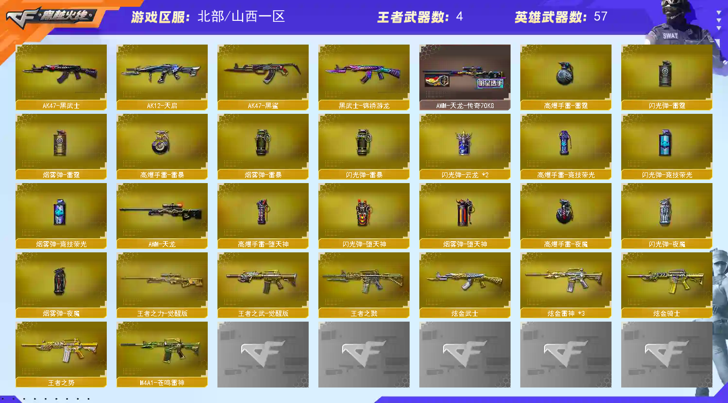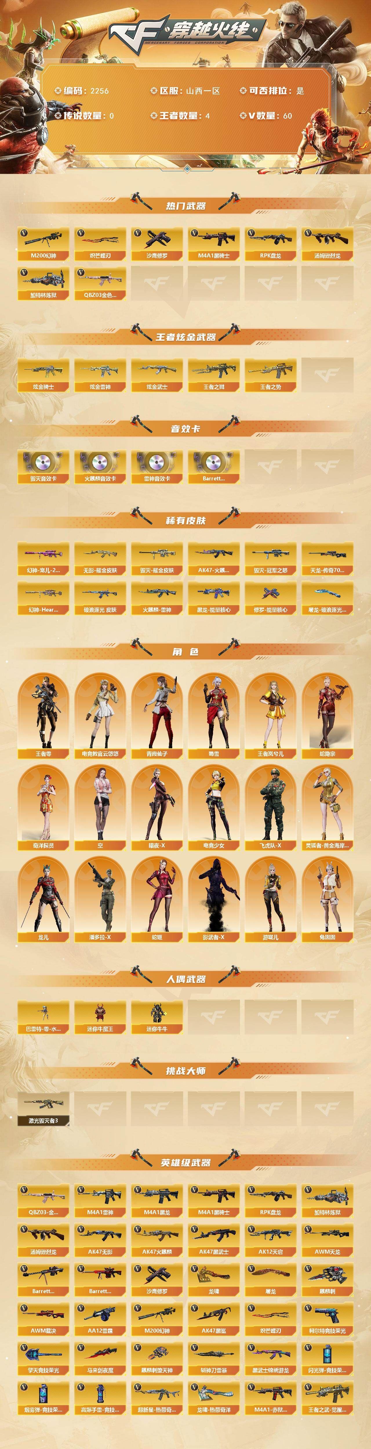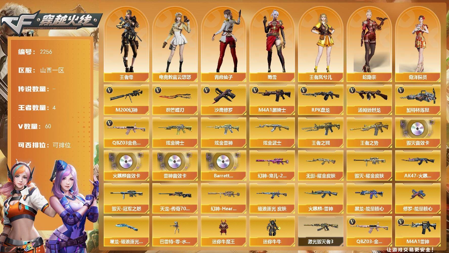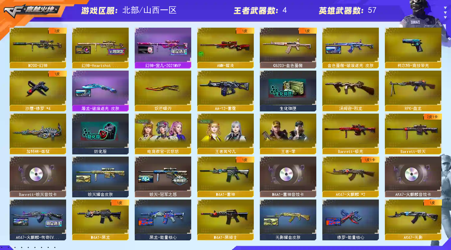 热门武器】:QBZ03-金色蔷薇,M200-幻神,M4A1-黑骑士,汤姆逊-烈龙,RPK-盘龙,加特林-炼狱,沙鹰-修罗*4,炽芒蝶刃【王者炫金武器】:王者之戮,王者之势,炫金骑士,炫金雷神*3,炫金武士【音效卡】:AK47-火麒麟音效卡,M4A1-雷神音效卡,Barrett-毁灭音效卡,Barrett-碧霄极光音效卡【皮肤】:幻神-宠儿-2021MVP,幻神-Heartshot 皮肤,金色蔷薇-破浪逐光 皮肤,火麒麟-雷神,AK47-火麒麟-传奇EVEN,毁灭耀金皮肤,毁灭-冠军之怒,黑龙-能量核心,无影耀金皮肤,AWM-天龙-传奇70KG,修罗-能量核心,屠龙-破浪逐光 皮肤【角色】:电竞教官-云悠悠,王者-零,王者岚兮儿,蛇隐宗,奇洋探员,空,暗夜-X,电竞少女,飞虎队-X,灵狐者-黄金海岸,龙儿,潘多拉-X,青霞仙子,蛇姬,蜀雪,兔囡囡,影武者-X,游珑儿【人偶武器】:巴雷特-零-水下丽影,迷你牛魔王,迷你牛牛【挑战大师】:激光毁灭者III【英雄级武器】:AK47-火麒麟*2,M4A1-黑龙,M4A1-雷神,M4A1-黑骑士,AK47-无影,AK47-黑武士,AK12-天启,AK47-黑鲨,黑武士-锦绣游龙,超新星-热带奇洋,QBZ03-金色蔷薇,王者之武-觉醒版,AWM-天龙,Barrett-毁灭,Barrett-极光,AWM-裁决,M200-幻神,王者之力-觉醒版,RPK-盘龙,加特林-炼狱,汤姆逊-烈龙,AA-12-雷霆,沙鹰-修罗*4,柯尔特-竞技荣光,屠龙,龙啸*2,麒麟刺-堕天神,马来剑-夜魔,麒麟刺,擎天-竞技荣光,炽芒蝶刃,龙啸-热带奇洋,斩神刀-雷暴,高爆手雷-雷霆,高爆手雷-雷暴,高爆手雷-堕天神,高爆手雷-夜魔,高爆手雷-竞技荣光,手雷-热带奇洋,高爆手雷-古蛇迷踪,闪光弹-雷霆,闪光弹-雷暴,闪光弹-堕天神,闪光弹-夜魔,闪光弹-竞技荣光,闪光弹-云龙*2,烟雾弹-雷霆,烟雾弹-雷暴,烟雾弹-堕天神,烟雾弹-夜魔,烟雾弹-竞技荣光,烟雾弹-古蛇迷踪,M4A1-赤狱骑士,M4A1-苍鸣雷神【道具】:CFS限定背包,奇洋探员-海龟背包,炫彩背包,热带奇洋炫彩背包,超级背包,绿色巨人,生化弹匣,夺命之镰,防化服,金色流光-枪王排位,星辰流光-枪王排位,枪王排位28赛季金色流光,枪王排位29赛季金色流光,语音特效-机器人,语音特效-生化,热带奇洋表情,EP战队名片,EP战队喷图,防弹头盔*3,防弹衣*3,C4工具钳*3,手雷包*2【特殊枪械】:1黑骑士,1烈龙,1盘龙,1炼狱,;