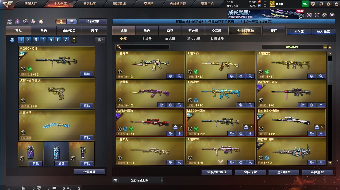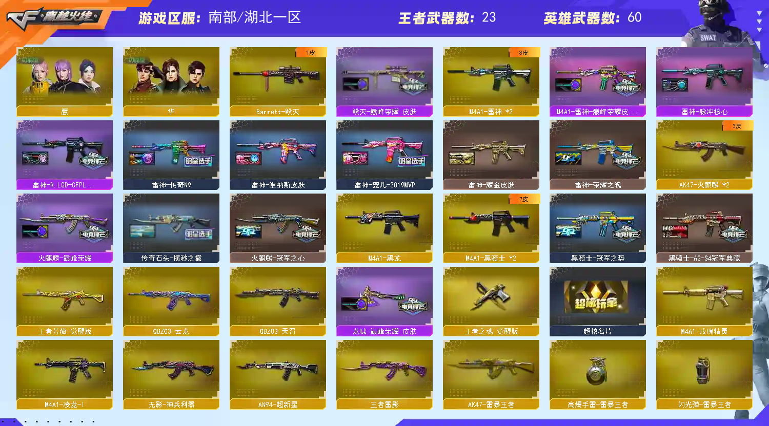 【传说影煞】【传说星骇】【M200-幻神+幻神-荣耀世冠EP皮肤+幻神-电流骇客皮肤+幻神-AG-CFPL S24冠军皮肤+幻神-欧欧皮肤+幻神-荣耀世冠白鲨2023皮肤+M200-幻神-N9-2022MVP+幻神-宠儿-2021MVP+幻神-冠军之幻+幻神-AG-CFPLS17冠军+M200-幻神音效卡】【传说破晓】【炽芒蝶刃(2)】【Kar98K-星神+Kar98K-星神-冠军之星皮肤+星神-枪娘默皮肤+星神-破竹皮肤+星神-璀璨皮肤】【AWM-裁决+裁决-叶芒苍灵皮肤+裁决-巅峰荣耀皮肤+裁决-羽掣皮肤+AWM-裁决音效卡】【Knife-冠军之刃】【柯尔特-冠军之特+柯尔特-荣耀世冠EP(2)+柯尔特-荣耀世冠白鲨2023】【USP-冥王】【Scar Light-白虎+白虎-白鲨-CFPLS23冠军+ScarLight-白虎-冠军之虎皮肤+白虎-AG-CFPLS20冠军】【G36C-幻影】【QBZ03-金色蔷薇+QBZ03-金色蔷薇-拼搏】【5烈龙】【1炼狱+炼狱-悦蓝-觉醒版+炼狱-末日审判皮肤】【M4A1-雷神+M4A1-雷神-巅峰荣耀皮肤+雷神-R.LGD-CFPLS18冠军+雷神-宠儿-2019MVP+雷神-传奇N9+雷神-荣耀之魄+雷神-耀金皮肤+雷神-脉冲核心+雷神-维纳斯皮肤】【AK47-火麒麟(2)+火麒麟-CFSTAR+火麒麟-巅峰荣耀+火麒麟-枪娘凯特琳+火麒麟-冠军之心+传奇石头-横秒之巅】【Barrett-毁灭+毁灭-巅峰荣耀皮肤+巴雷特-毁灭-CFPL冠军+巴雷特SV皮肤】【M4A1-黑骑士(2)+黑骑士-冠军之势+黑骑士-AG-S4冠军典藏】【鹰/晴雅/隼/华/战地猎狐/妮妮/玄豹/王者零-传说之路/代号:翼/铁扇公主/乔伊教练/云海玲珑/炽天使/空】【王者之力-觉醒版/M4A1-死神/M4A1-黑龙/M4A1-玫瑰精灵/王者之武-觉醒版/王者之势-觉醒版/王者龙血-觉醒版/M14EBR-玄武/无影-神兵利器/AN94-超新星/QBZ03-云龙/QBZ03-天罚/王者之心-觉醒版/COP 357-云龙(2)/沙鹰-天神(2)/沙鹰-修罗(2)/王者之魂-觉醒版/云龙扇/麒麟刺/龙啸/擎天/屠龙/FAMAS G2-天戎/王者芳薇-觉醒版/烟雾弹-荣耀世冠EP/闪光弹-玄豹/高爆手雷-玄豹/烟雾弹-玄豹/手雷-云海游龙】【白虎-迷你小艾/雷神-小红/AWM-灵狐-15周年嘉年华/炼狱-迷你小钢/异变清道夫-蛇影双骄/斯泰尔-枪娘暗刃/MK5-炽火炎龙/迷你深渊冰龙-王绿豆/魔能飞环-曼陀罗(2)】【AWM-天龙+天龙-CFSTAR】【QBZ03-荣耀世冠EP皮肤+QBZ03-巅峰荣耀皮肤+QBZ03-AG-CFPLS19冠军+QBZ03-传奇宠儿】【沙鹰-修罗+修罗-CFSTAR】【屠龙-巅峰荣耀皮肤+屠龙-荣耀之锋】【龙啸-巅峰荣耀皮肤】;USP-雷暴王者,柯尔特-荣耀世冠白鲨2023,柯尔特-冠军之特,炽芒蝶刃,Knife-冠军之刃,传说影煞,传说星骇,