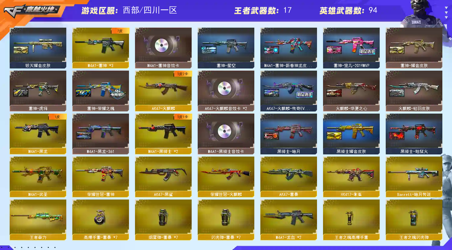 【传说暗裔】【M200-幻神(2)+M200-幻神-黄忠皮肤+幻神-冠军之幻+M200-幻神音效卡】【Kar98K-星神】【AWM-裁决+裁决-胜者为王皮肤+裁决-流光秘银】【Scar Light-白虎+ScarLight-白虎-冠军之虎皮肤】【QBZ03-金色蔷薇(2)+QBZ03-荣耀世冠EP皮肤】【王者之光-觉醒版/王者之势-觉醒版/王者冰魄-觉醒版/王者炎心-觉醒版/王者之心-觉醒版/王者之啸-觉醒版】【沙鹰-天神(2)/沙鹰-修罗(3)/荣耀世冠-柯尔特/USP-雷暴】【麒麟刺/龙啸(4)/荣耀世冠-龙啸/擎天/屠龙(3)/斩神刀-雷暴】【荣耀世冠套装/雷暴套装】【6盘龙/6烈龙/4炼狱】【斯泰尔-蝴蝶】【王者之势/王者之心/王者森力/王者之怒/王者之锋(2)】【葵/春/妮妮/幻面灵狐/王者-魅影/王者-迷迭香/修道士/乔伊教练/职业选手/灵狐者-职业经理/樱-缤纷夏日/零-水下丽影/零-热舞青春】【M4A1-雷神音效卡/M4A1-黑骑士音效卡/AK47-火麒麟音效卡/Barrett-毁灭音效卡】【巴雷特-毁灭-CFPL冠军/毁灭-星空/毁灭耀金皮肤/毁灭-暗月/毁灭-黑大圣皮肤/巴雷特SV皮肤/天龙-CFSTAR/AK47-火麒麟-传奇EVEN/火麒麟-CFSTAR/火麒麟-华夏之心/火麒麟-轻羽皮肤/M4A1-雷神-白鲨皮肤/雷神-宠儿-2019MVP/雷神-荣耀之魄/雷神-虎将/雷神-耀金皮肤/雷神-星空/M4A1-雷神-新春神龙皮肤/黑骑士-地狱火/黑骑士耀金皮肤/黑骑士-暗月/M4A1-黑龙-361】【Barrett-毁灭(2)/Barrett-极光/Barrett-暗月传说/M4A1-雷神(2)/荣耀世冠-雷神/M4A1-黑龙/M4A1-龙血(2)/M4A1-黑骑士(2)/M4A1-武圣/HK417-朱雀/HK417-朱雀-电竞之星/AK47-火麒麟/荣耀世冠-火麒麟/AK47-雷暴/AK47-黑鲨/9A91-烈火(2)/屠龙-电竞之星】;USP-雷暴,荣耀世冠-柯尔特,妮妮,RPK-盘龙,QBZ03-金色蔷薇,M200-幻神,Scar Light-白虎,