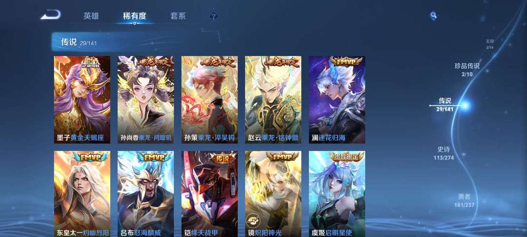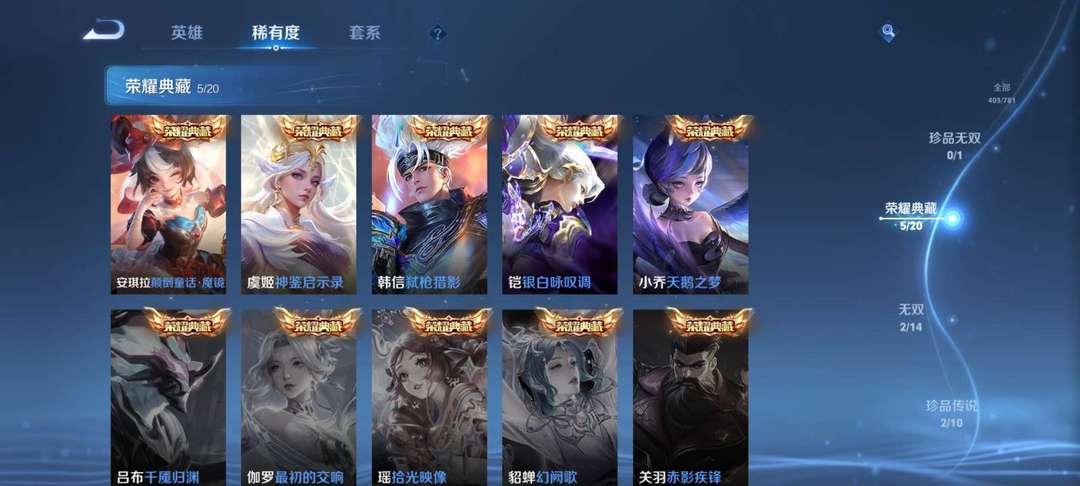 v10、537皮6水4无双、安琪拉-颠倒童话·魔镜、朵莉亚-神骥、遇见神鼓、齐天大圣、白虎志、韩信荣耀典藏、73传说、时之魔女、瑶无双、青丘、九尾、神器明辉仪