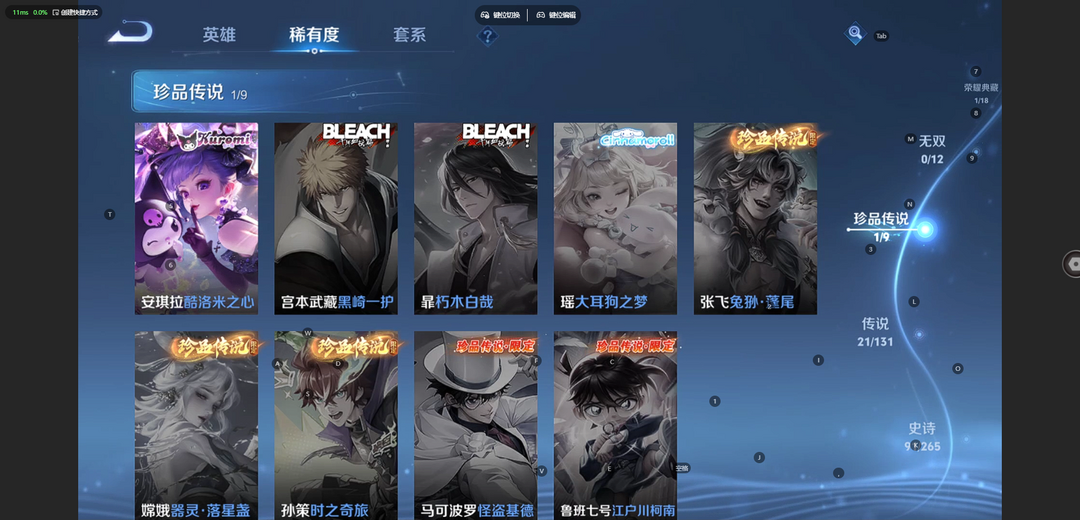 v10、537皮6水4无双、安琪拉-颠倒童话·魔镜、朵莉亚-神骥、遇见神鼓、齐天大圣、白虎志、韩信荣耀典藏、73传说、时之魔女、瑶无双、青丘、九尾、神器明辉仪