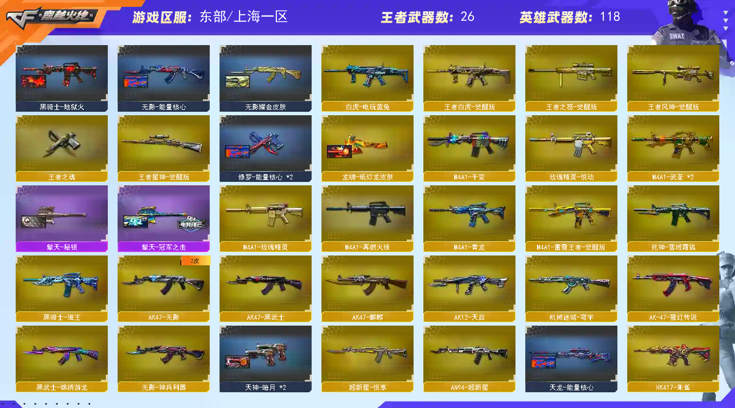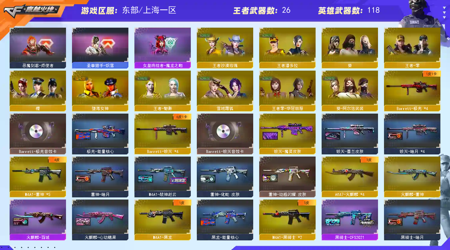 【亮点解析 幻神4皮 裁决三件套 生化满配】【m200幻神+传奇欧欧+动感闪耀皮肤+纸灯龙+荣耀世冠白鲨+冠军之特+usp雷暴】【王者星神 王者风神 】【6烈龙 6炼狱 6盘龙 炼狱小刚 斯太尔蝴蝶 】【王者白虎】【qbz金色蔷薇+宠儿】【朱雀】【火麒麟】【黑龙】【雷神】【黑骑士】【毁灭+卡】【极光+卡】【裁决+裁决音效卡+叶芒苍灵】【武器:武圣 青龙 王者之心 王者之魄 雷霆王者 白虎电玩 】【14手枪:修罗*7 天神 武圣 雷暴 冠军之特 】【15刀具:屠龙*4 龙啸 擎天 麒麟刺 王者之击 王者冰锋 】【雷套:幻灵雷*2】【音效卡:毁灭音效卡 裁决音效卡 极光音效卡 】【四防角色:王者魅影 王者零华冠丽服 王者潘多拉 王者沙漠玫瑰 】;USP-雷暴,柯尔特-冠军之特,王者沙漠玫瑰,RPK-盘龙,QBZ03-金色蔷薇,M200-幻神,