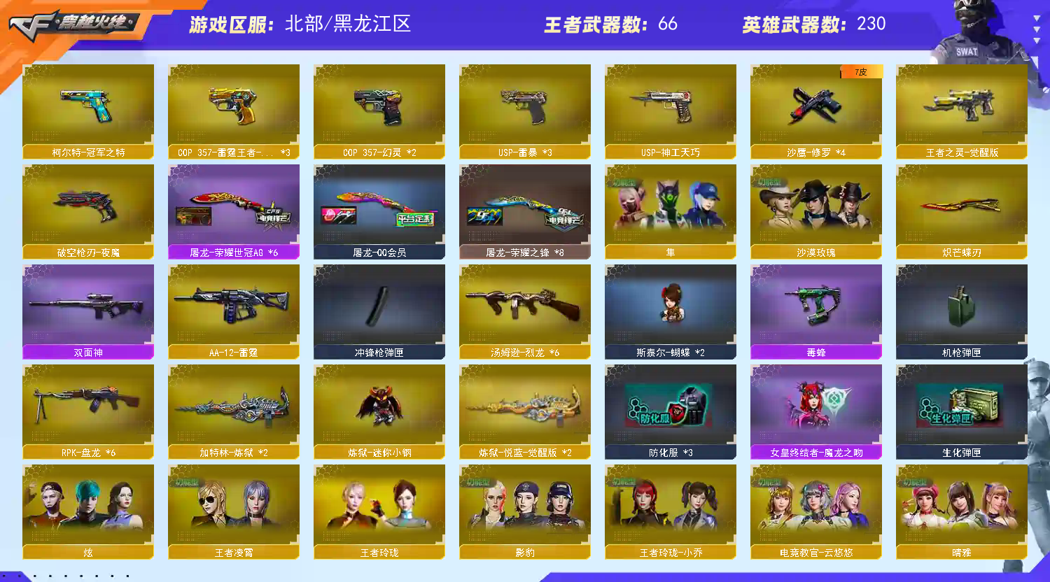 编号:HJ129北部黑龙江大区✅四防传说女帝+7传说6盘炼狱6烈龙蝴蝶+炽芒蝶刃✅3幻神10件套+雷暴夜魔套✅柯尔特冠军之特+星神幻影✅ 稀有武器:传说光耀X2、传说暗裔、传说圣灵、传说梦魇、传说灵眸、M200幻神X3、98K星神、M200竞技荣光、盘龙X6、炼狱X4、烈龙X6、烈龙云海游龙、烈龙悦心、G36C幻影、千变X2、火麒麟X5、黑龙X4、雷神X6、黑骑士X6、无影、死神、黑武士、天启、黑鲨、龙血、雷暴、M4A1青龙、HK417朱雀、Scar白虎、M4A1夜魔、M4A1幻灵、无影神兵利器、黑武士锦绣游龙、超新星热带奇洋、源雷神、天罚斗烈龙驹、玫瑰精灵、QBZ金色蔷薇X2、烈火、烈火动感闪耀、荣耀世冠火麒麟、荣耀世冠雷神、天龙、毁灭X5、极光、裁决X4、Barrett朱雀、Barrett电竞装甲、暗月传说、雷霆、修罗X4、USP雷暴X3、破空枪刃夜魔、柯尔特电竞装甲、COP幻灵X2、柯尔特竞技荣光、USP神工天巧、天神动感闪耀、荣耀世冠柯尔特X6、柯尔特冠军之特、屠龙X7、龙啸X2、擎天X2、麒麟刺、斩神刀雷暴、麒麟刺堕天神、龙啸堕天神、马来剑夜魔X2、尼泊尔电竞装甲、幻灵之锋X3、擎天竞技荣光X2、炽芒蝶刃、唐刀神工天巧、屠龙动感闪耀、擎天云海游龙、龙啸热带奇洋、屠龙斗烈龙驹、荣耀世冠龙啸X5、AWM昌龙 稀有角色:传说艾丽莎(四防:减少闪光效果+免疫队友炸弹伤害+减少掉落伤害+副武器自动装弹)、传说女帝(四防:减少闪光效果+免疫队友炸弹伤害+减少掉落伤害+觉醒肾上腺素)、四防电竞教官云悠悠、四防沙漠玫瑰、葵、零、四防晴雅、审判者、瞳、樱、鹰、影豹、炫、隼、魅影、零纪元、战地猎狐、斗烈龙驹、奇洋探员、乔伊教练、王者春、王者葵貂蝉、王者零、王者零国色天香、王者瞳闭月羞花、王者魅影、王者葵惊若翩鸿、王者玲珑、王者玲珑小乔、王者凌霄、王者潘多拉、王者樱热浪之夏、云海玲珑、修道士、零水下丽影 音效卡:M200幻神音效卡、毁灭音效卡X4、黑骑士音效卡、屠龙斗烈龙驹音效卡、极光音效卡、火麒麟音效卡X3、黑骑士音效卡、AWM昌龙怀旧音效卡、天罚斗烈龙驹音效卡、Scar白虎音效卡、黑龙音效卡 稀有皮肤:幻神星火小队签名臻藏版皮肤/电流骇客皮肤/荣耀世冠白鲨皮肤/降龙皮肤/巅峰荣耀皮肤/宠儿2021MVP皮肤/周瑜皮肤/冠军之幻皮肤/黄忠皮肤、黑骑士少林皮肤/摸金校尉皮肤/AGS4冠军典藏/CFS2021皮肤/地狱火皮肤/战神马超皮肤/冠军之势皮肤/暗月皮肤/耀金皮肤、毁灭墨兰皮肤/枪娘格雷皮肤/青帝皮肤/风暴皮肤/荣耀之怒皮肤X2/CFS2018皮肤/CFS2020皮肤/黑大圣皮肤/BEAN2020MVP皮肤/耀金皮肤/星空皮肤、火麒麟巅峰荣耀皮肤/百城皮肤/传奇EVEN皮肤/枪娘凯萨林皮肤/荣耀世冠AG皮肤/盘古皮肤/CFSTAR皮肤X5/CFS2018皮肤/平天大圣皮肤/战神关羽皮肤/AG战队皮肤/轻羽皮肤/华夏之心皮肤/冠军之心皮肤、QBZ金色蔷薇传奇宠儿皮肤/荣耀世冠白鲨皮肤/斗鱼皮肤/AGCFPLS19冠军皮肤/冠军之薇皮肤、雷神虎牙平台皮肤/CFS十周年纪念版皮肤/荣耀之魄皮肤X2/荣耀世冠AG皮肤CFPLS18冠军皮肤/CFS2019皮肤/战神赵云皮肤/宠儿2019MVP皮肤/耀金皮肤/星空皮肤X4、白虎冠军之虎皮肤/AGCFPLS冠军皮肤/电玩粉兔皮肤、屠龙荣耀世冠AG皮肤X6/荣耀之锋皮肤X8/Q员皮肤、黑龙冠军之武皮肤/361皮肤/能量核心皮肤/暗月皮肤、擎天冠军之击皮肤、 王者炫金武器:王者炎心、王者之心、王者之翼X2、QBZ王者蔷薇、王者凤吟、M4A1雷霆王者、王者冰魄、王者之幻、王者之魄、王者之圣、王者之势、王者之武、王者CAT、Barrett雷霆王者、王者风神、王者幻神、王者蔷薇、王者之光、王者之决、王者星神、COP雷霆王者X3、王者之灵、雷霆王者之锋X2、王者玉锋、王者之刺、王者之锋X2、王者之击X2、王者之啸X3、炫金火麒麟、炫金天龙 投掷套装:雷暴套X5、堕天神套、夜魔套X2、恶棍电竞装甲X7、幻灵套X8、竞技荣光套、神工天巧套、动感闪耀套、云海游龙套、热带奇洋套、雷霆王者套X4、肥皂手雷X2、凤凰之息X2、迷你生化手雷 小人枪武器特殊武器:QBZ嘉年华柯基、M4A1雷神精英刀锋、火麒麟绝迹、雷神小红、裁决雪莉杨、毁灭孙三炮、炼狱迷你小刚、COP白鲨X3、MK5炽火炎龙、毒蜂、金魔X2、牛牛AK47贵族金、巴雷特零水下丽影、斯泰尔蝴蝶X2、死亡之眼、KAC锯式机枪黑桃战神、黄金猫猫手套白鲨、黄金猫猫手套、金刚伞、M4A1刀锋、AWM灵狐15周年嘉年华、M37葵、COP旗袍、USP嘉年华柯基、猫猫COP357;USP-雷暴,荣耀世冠-柯尔特,柯尔特-冠军之特,炽芒蝶刃,Knife-冠军之刃,沙漠玫瑰,传说女帝,