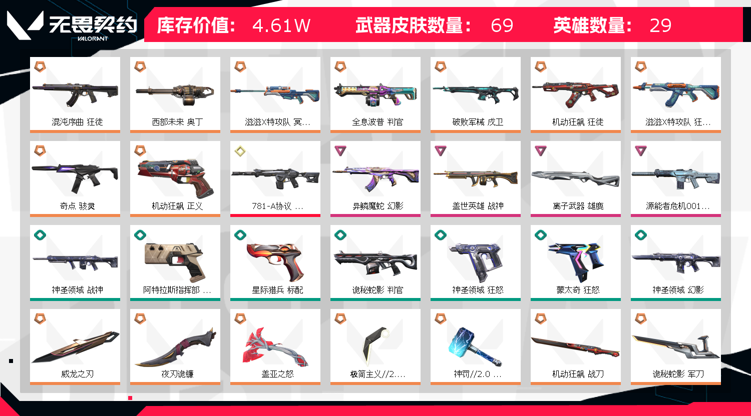 首页 > 租号大厅 > 无畏契约-wegame > wegame/wegame > 秒解冻可排位极品5w库存✨滋滋特攻套夜刃✨混沌狂飙狂徒✨西部奇点波谱✨离子源能者威龙之刃极简主义