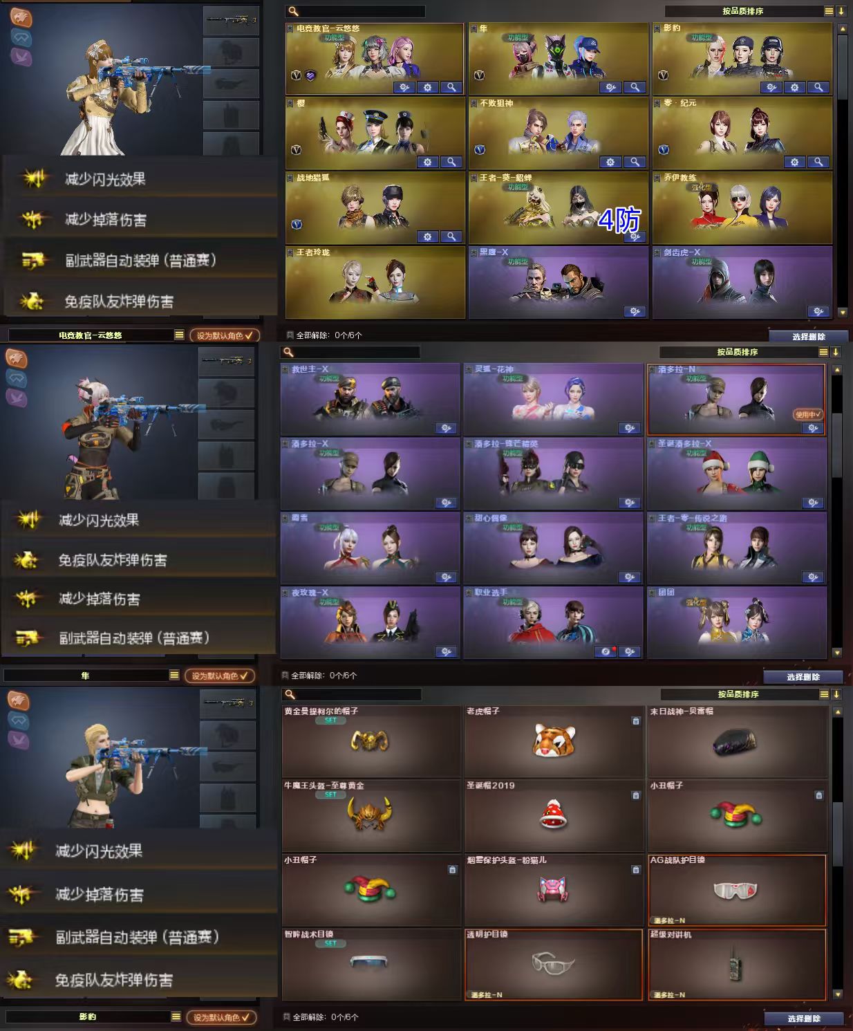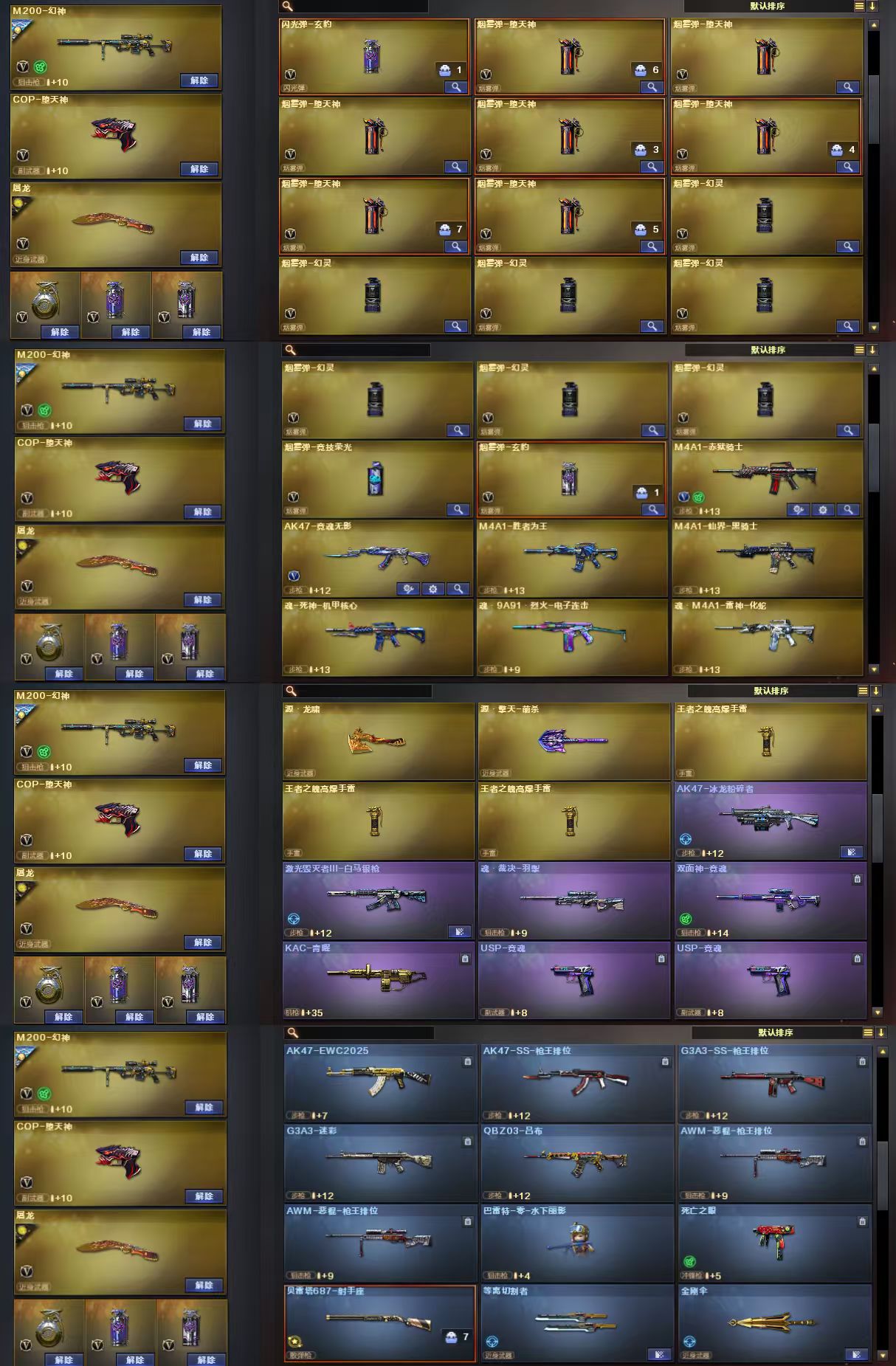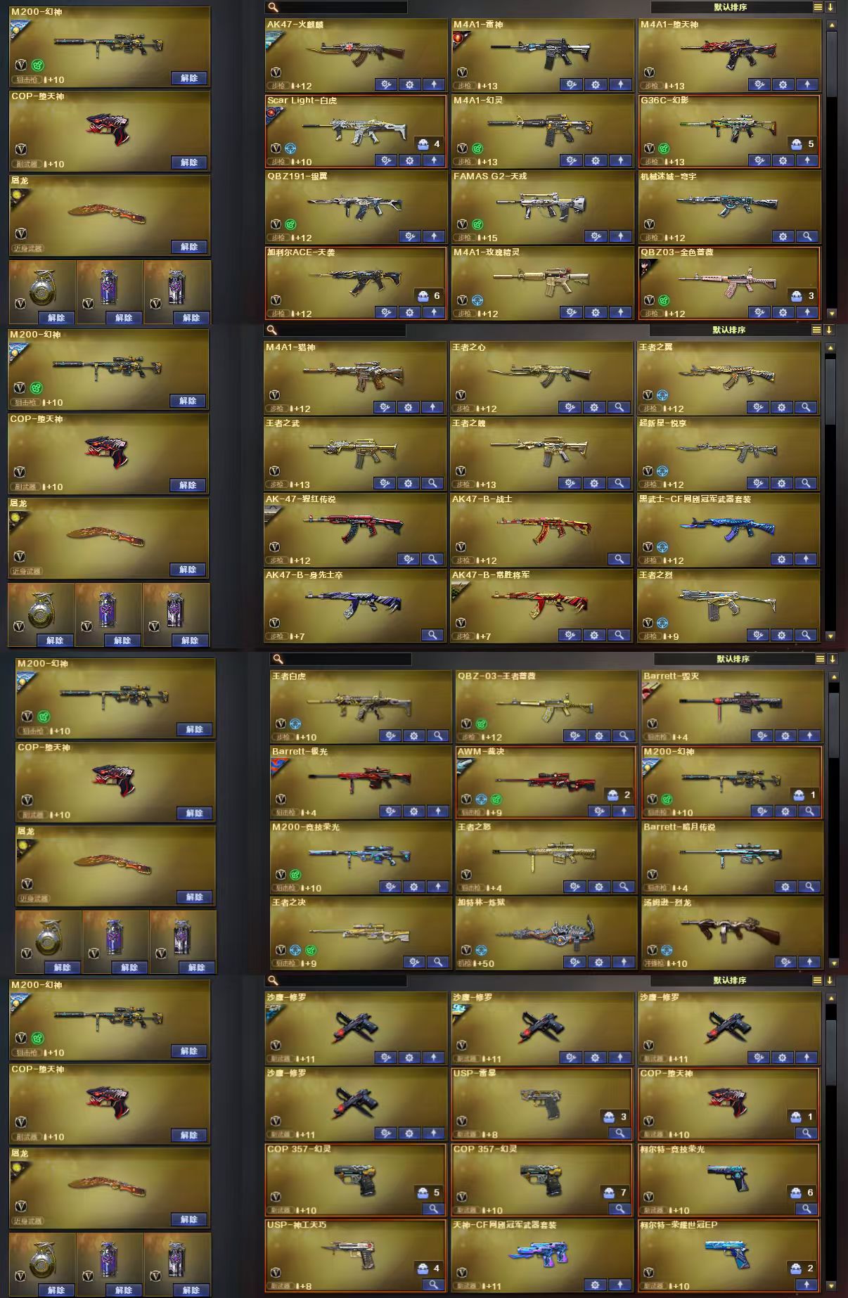 幻神世冠EP+冠军AG+幻神音效卡/竞技荣光套/裁决叶芒苍灵+运输船+裁决音效卡/极光能量核心/毁灭冠军S V/白虎暗星+大汉风骨+拼搏/G36C幻影/法玛斯天戎/加利尔天袭/qbz冠军AG+qbz音效卡/qbz银翼/王者qbz/王者白虎/火麒麟横秒之巅+火麒麟音效卡/雷神炽焰魔龙/COP堕天神/COP幻灵*2/USP雷暴/USP神工天巧/世冠EP柯尔特/荣光柯尔特/角色:4防云悠悠/4防隼/4防影豹/4防王者葵貂蝉+其他角色/;USP-雷暴,隼,电竞教官-云悠悠,QBZ03-金色蔷薇,G36C-幻影,M200-幻神,Scar Light-白虎,