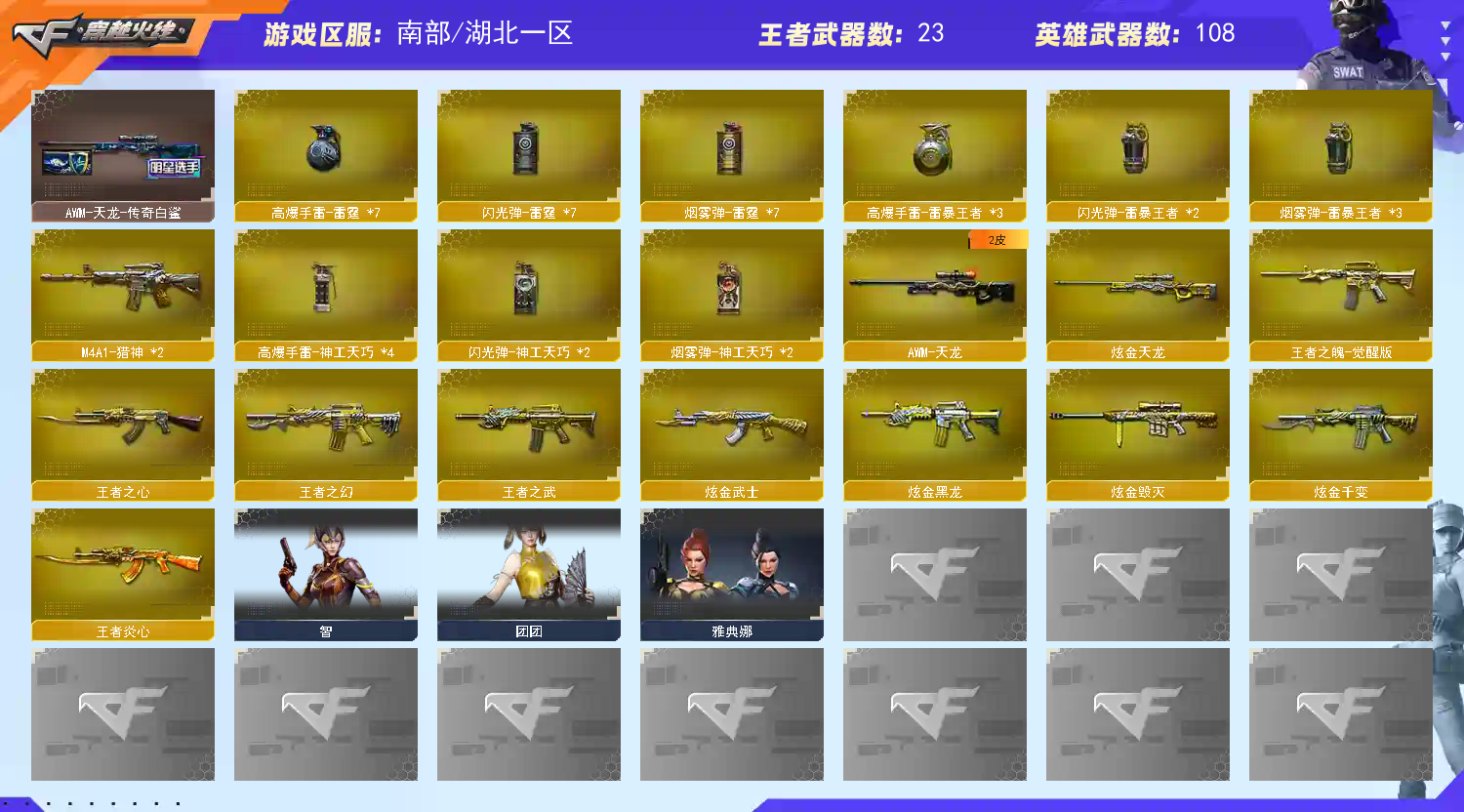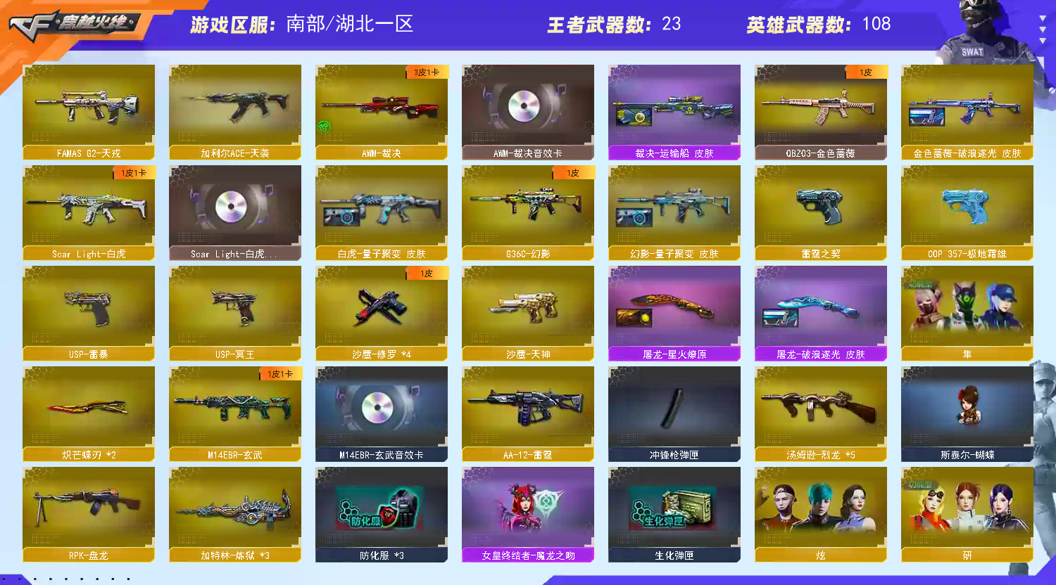 🌟稀有角色:智|机械姬|隼|炫|妍|潘多拉-N|暗夜-N|雅典娜|灵狐者-职业经理|灵狐者-黄金海岸|堕落女神|兰-海滩派对 🌟英雄级步枪:Scar-Light-白虎|FAMAS G2-天戎|G36C-幻影|QBZ191-银翼|M14EBR-玄武|加利尔ACE-天袭|QBZ03-天罚x2|QBZ03-金色蔷薇|M4A1-雷神x 2|M4A1-黑骑士|M4A1-黑龙x2|M4A1-雷霆|M4A1-猎神x2|M4A1-武圣|AK47-火麒麟|AK47-无影x2|AK47-机械迷城x2|AK47-黑鲨|AN94-超新星|AK12-天启|9A91-烈火| 🌟英雄级狙击:Kar98k-量子之心|Barrett-毁灭x5|Barrett-极光x3|Barrett-雷霆|AWM-裁决|AWM-天龙| 🌟英雄级冲锋枪:汤姆逊-烈龙x5 🌟英雄级机枪:加特林-炼狱x3|RPK-盘龙 🌟英雄级散弹枪:AA12-雷霆 🌟英雄级手枪:USP-冥王|USP-雷暴|COP-雷霆|COP-极地霜熊|Anaconda-量子之心|沙鹰-修罗x4|沙鹰-天神|Glock18-武圣 🌟英雄级近战:扳手-量子之心|屠龙x7|龙啸x2|炽芒蝶刃x2|尼泊尔-雷霆|麒麟刺 🌟英雄级投掷:雷霆套x7| 神功天巧套x1| 雷暴王者套x2 |量子之心套x1 🌟王者武器:王者幻神|王者炎心|王者之魄|王者之幻|王者之心|王者之武|王者之击|王者之峰|王者之啸x2|炽渊之怒|斩神刀-雷暴王者 🌟炫金武器:炫金黑龙|炫金毁灭|炫金武士|炫金天龙|炫金千变|炫金修罗 🌟稀有小人枪:斯泰尔蝴蝶|雷神-妍|COP-旗袍|COP-白鲨|USP-摇滚精灵|M82A1-水枪-不败狙神|蓝色迷你猩红司令-M37|KAC锯式机枪-黑挑战神 🌟高手投掷:粉色烟雾弹x6 🌟音效卡:裁决音效卡|白虎音效卡|雷神音效卡|毁灭-音效卡|火麒麟-音效卡|黑骑士-音效卡|玄武-音效卡|天罚-音效卡 🌟热门皮肤:雷神荣耀 星空 能量|黑骑士冠军|玄武量子|火麒麟女团 AG|白虎量子|幻影量子 音盒|裁决星际 运输船|毁灭星空 耀金|天龙白鲨 秘银|极光能量|金色蔷薇破浪|屠龙破浪 星火|修罗冠军;USP-雷暴,炽芒蝶刃,隼,RPK-盘龙,QBZ03-金色蔷薇,G36C-幻影,Scar Light-白虎,