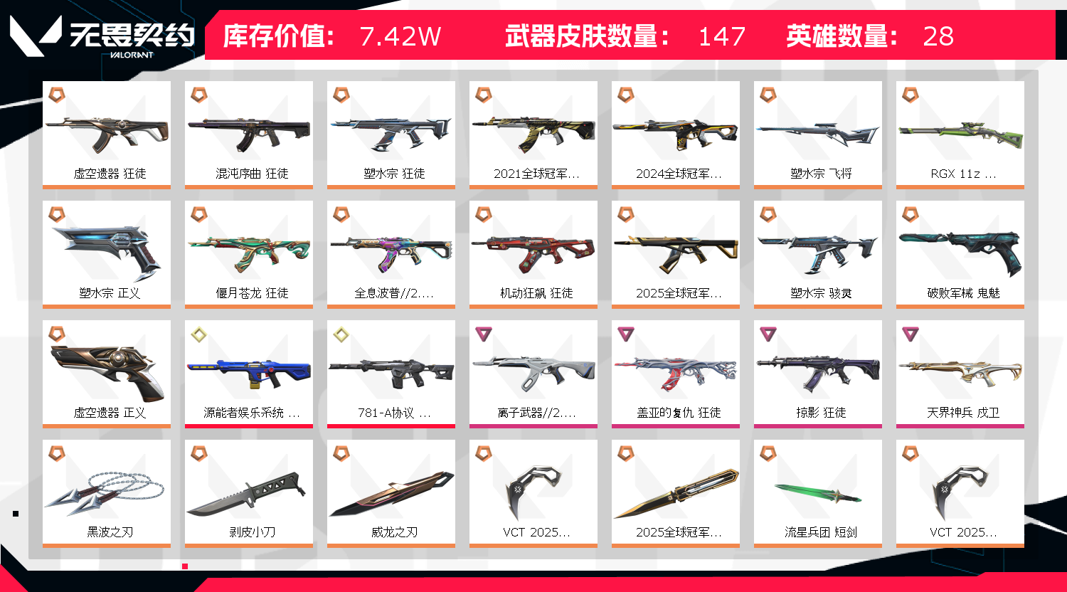 7.5w库存⚡️21冠军⚡️24冠军⚡️25冠军⚡️塑水套⚡️vct爪;黑波之刃,剥皮小刀,威龙之刃,VCT 2025 爪刀,盖亚的复仇 狂徒,虚空遗器 狂徒,掠影 狂徒,