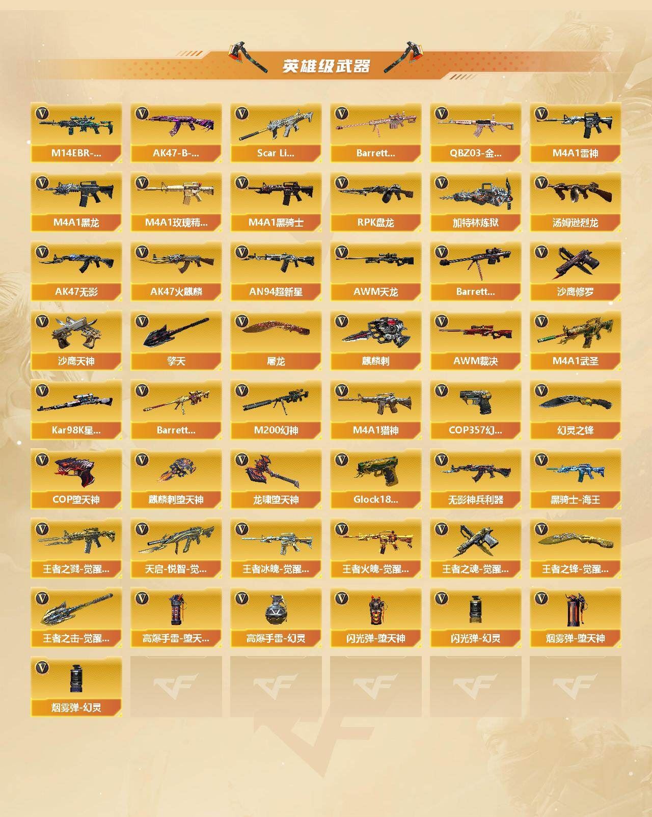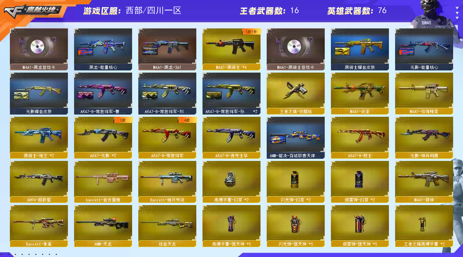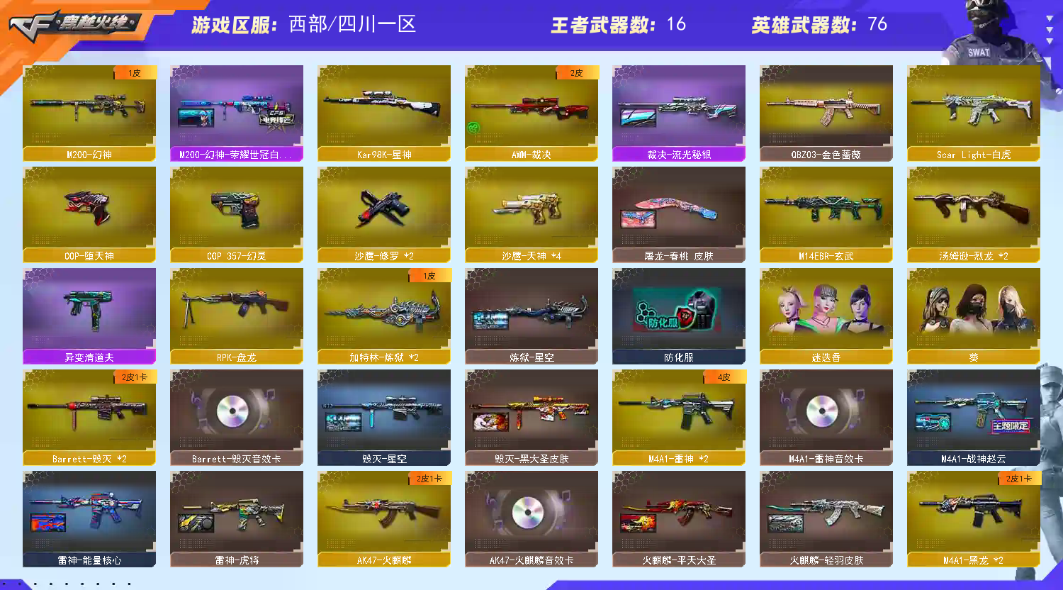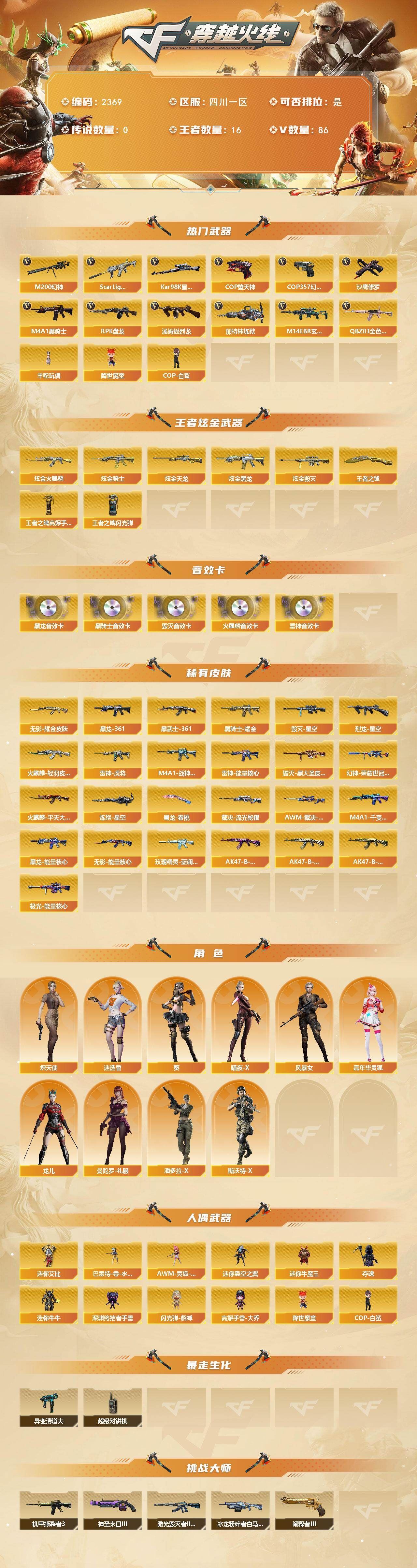 【热门武器】:QBZ03-金色蔷薇,M14EBR-玄武,Scar Light-白虎,M200-幻神,Kar98K-星神,M4A1-黑骑士*4,汤姆逊-烈龙*2,RPK-盘龙,加特林-炼狱*2,羊驼玩偶,降世魔童,COP-白鲨,COP-堕天神,COP 357-幻灵,沙鹰-修罗*2【王者炫金武器】:王者之锋,炫金火麒麟,炫金骑士,炫金黑龙,炫金毁灭,炫金天龙,王者之魄高爆手雷*2,王者之魄闪光弹*5【音效卡】:AK47-火麒麟音效卡,M4A1-雷神音效卡,M4A1-黑龙音效卡,M4A1-黑骑士音效卡,Barrett-毁灭音效卡【皮肤】:M200-幻神-荣耀世冠白鲨,裁决-流光秘银,AWM-裁决-百城联赛天津皮肤,烈龙-星空,雷神-能量核心,雷神-虎将,M4A1-战神赵云,火麒麟-轻羽皮肤,火麒麟-平天大圣,毁灭-星空,毁灭-黑大圣皮肤,M4A1-千变-孔明皮肤,黑龙-能量核心,M4A1-黑龙-361,黑骑士耀金皮肤,无影-能量核心,无影耀金皮肤,AK47-黑武士-361,玫瑰精灵-蓝调梦幻 皮肤,AK47-B-常胜将军-曹操,AK47-B-常胜将军-刘备,AK47-B-常胜将军-孙权*2,极光-能量核心,炼狱-星空,屠龙-春桃 皮肤【角色】:葵,迷迭香,炽天使,暗夜-X,风暴女,嘉年华灵狐,龙儿,曼陀罗-礼服,潘多拉-X,斯沃特-X【人偶武器】:COP-白鲨,巴雷特-零-水下丽影,AWM-灵狐-15周年嘉年华,迷你裂空之翼,迷你牛魔王,夺魂,迷你牛牛,深渊终结者手雷,闪光弹-貂蝉,高爆手雷-大乔,迷你艾比,降世魔童【暴走生化】:异变清道夫,超级对讲机【挑战大师】:冰龙粉碎者-白马银枪,激光毁灭者III-白马银枪*2,机甲撕裂者III,神圣爆裂者-末日III,阐释者III【英雄级武器】:AK47-火麒麟,M4A1-黑龙*2,M4A1-雷神*2,M4A1-黑骑士*4,AK47-无影*2,AN94-超新星,M4A1-武圣,Scar Light-白虎,M14EBR-玄武,无影-神兵利器,M4A1-玫瑰精灵,QBZ03-金色蔷薇,M4A1-猎神,王者之戮-觉醒版,天启-悦智-觉醒版,王者冰魄-觉醒版,王者火魄-觉醒版,黑骑士-海王*2,AK47-B-常胜将军,AWM-天龙,Barrett-毁灭*2,AWM-裁决,M200-幻神,Barrett-朱雀,Kar98K-星神,Barrett-金色蔷薇,RPK-盘龙,加特林-炼狱*2,汤姆逊-烈龙*2,沙鹰-修罗*2,沙鹰-天神*4,COP-堕天神,COP 357-幻灵,王者之魂-觉醒版,Glock18-武圣,屠龙,麒麟刺-堕天神,擎天,麒麟刺*2,幻灵之锋,龙啸-堕天神*2,王者之锋-觉醒版,王者之击-觉醒版*2,高爆手雷-堕天神*5,高爆手雷-幻灵*2,闪光弹-堕天神*5,闪光弹-幻灵*2,烟雾弹-堕天神*5,烟雾弹-幻灵*2【道具】:全能枪王背包,冰冰背包-猛男专用,战舰背包,炫彩背包,超级背包,夺命之镰,防化服,金色流光-枪王排位*2,星辰流光-枪王排位,枪王排位28赛季金色流光,枪王排位29赛季金色流光,防弹头盔*5,防弹衣*5,C4工具钳*4,手雷包*5【特殊枪械】:1白虎,4黑骑士,2烈龙,1盘龙,2炼狱】;RPK-盘龙,QBZ03-金色蔷薇,M200-幻神,Scar Light-白虎,Kar98K-星神,