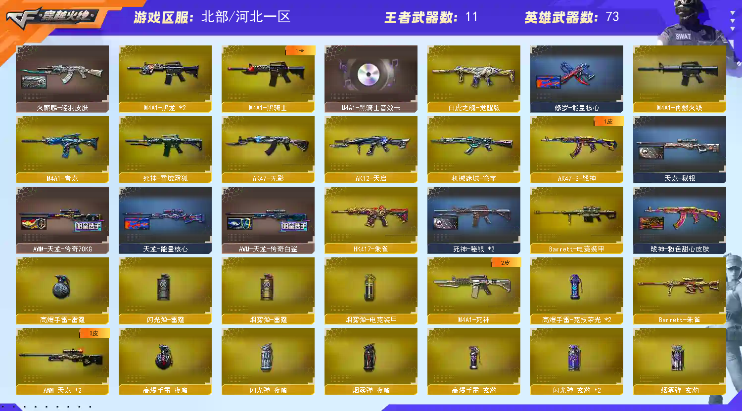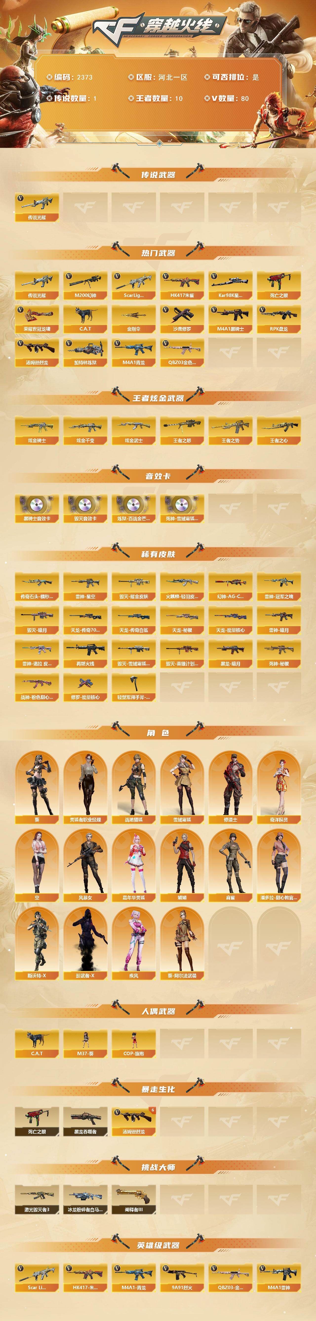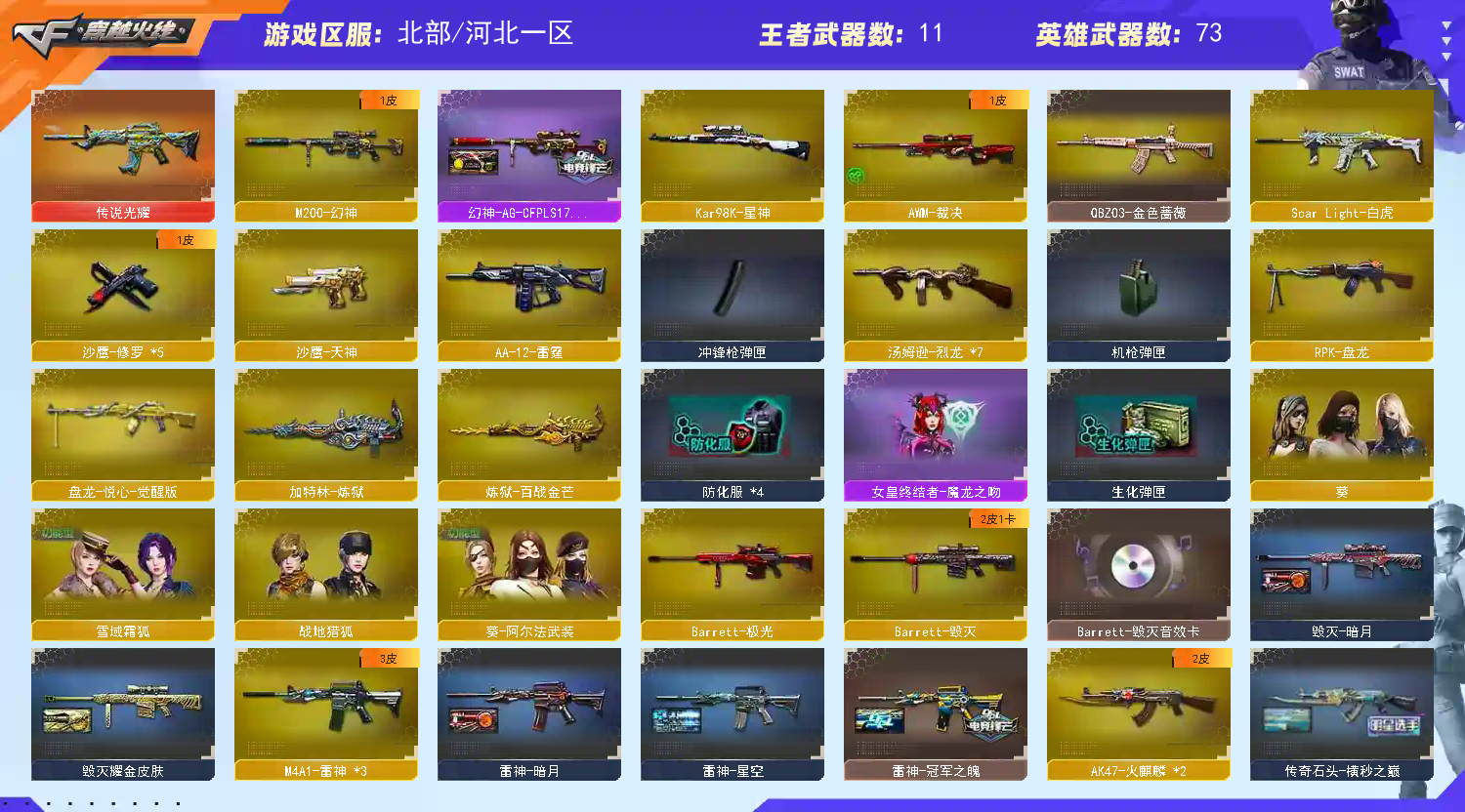 【传说武器】:传说光耀【热门武器】:传说光耀,QBZ03-金色蔷薇,Scar Light-白虎,HK417-朱雀,M4A1-青龙,M200-幻神,死亡之眼*2,Kar98K-星神,C.A.T,M4A1-黑骑士,汤姆逊-烈龙*7,RPK-盘龙,加特林-炼狱,沙鹰-修罗*5,荣耀世冠-龙啸,金刚伞【王者炫金武器】:王者之势,王者之心,王者之怒,炫金骑士,炫金千变,炫金武士【音效卡】:M4A1-黑骑士音效卡,Barrett-毁灭音效卡,炼狱-百战金芒-庆典舞曲音效卡,死神-雪域霜狐-怀旧音效卡【皮肤】:幻神-AG-CFPLS17冠军,雷神-暗月,雷神-星空,雷神-冠军之魄,雷神-诺拉 皮肤,M4A1-再燃火线,火麒麟-轻羽皮肤,传奇石头-横秒之巅,毁灭-暗月,毁灭耀金皮肤,毁灭-雪域霜狐 皮肤,毁灭-英雄计划 皮肤,黑龙-暗月*2,死神-秘银*2,战神-粉色甜心皮肤,天龙-秘银,天龙-能量核心,AWM-天龙-传奇70KG,AWM-天龙-传奇白鲨,修罗-能量核心,轻型军用手斧-再燃火线【角色】:葵,战地猎狐,雪域霜狐,奇洋探员,修道士,葵-阿尔法武装,空,风暴女,嘉年华灵狐,疾风,娟娟,灵狐者-职业经理,麻雀,潘多拉-甜心教官,斯沃特-X,影武者-X【人偶武器】:M37-葵,COP-旗袍,C.A.T【暴走生化】:黑龙吞噬者,死亡之眼*2【挑战大师】:冰龙粉碎者-白马银枪,激光毁灭者III,阐释者III*2【英雄级武器】:AK47-火麒麟*2,M4A1-黑龙*2,M4A1-雷神*3,M4A1-黑骑士,AK47-无影,M4A1-死神,AK12-天启,M4A1-青龙,HK417-朱雀,Scar Light-白虎,死神-雪域霜狐,QBZ03-金色蔷薇,9A91-烈火,王者之武-觉醒版,王者之魄-觉醒版,AK47-B-战神,王者火魄-觉醒版,白虎之魄-觉醒版,AWM-天龙*2,Barrett-毁灭,Barrett-极光,AWM-裁决,M200-幻神,Barrett-朱雀,Kar98K-星神,Barrett-电竞装甲,RPK-盘龙,加特林-炼狱,炼狱-百战金芒,盘龙-悦心-觉醒版,汤姆逊-烈龙*7,AA-12-雷霆,沙鹰-修罗*5,沙鹰-天神,屠龙*5,龙啸,马来剑-夜魔,麒麟刺,荣耀世冠-龙啸,麒麟刺-百战金芒,王者之锋-觉醒版,王者之啸-觉醒版,丛林匕首-玄豹,高爆手雷-雷霆,高爆手雷-夜魔,高爆手雷-竞技荣光*2,高爆手雷-玄豹,闪光弹-雷霆,闪光弹-夜魔,闪光弹-玄豹*2,烟雾弹-雷霆,烟雾弹-夜魔,烟雾弹-玄豹,M4A1-赤狱骑士【道具】:AG战队炫彩背包,云山科技背包,亚洲杯纪念炫彩背包,炫彩背包,百战金芒炫彩背包,背包-洛丽塔,虎牙炫彩背包,超级背包,雪域霜狐炫彩背包,女皇终结者-魔龙之吻,救世主-黑桃战神,黄金生化钩,绿色巨人,灵魂忍者,迷雾幽灵,夺命之镰,防化服*3,金色流光-枪王排位*2,星辰流光-枪王排位,流光-再燃火线,枪王排位28赛季金色流光,枪王排位29赛季金色流光,语音特效-盛典烟火,语音特效-怀旧,雪域霜狐表情,萌萌小葵表情,防弹头盔*3,防弹衣*3,C4工具钳*3,手雷包*3【特殊枪械】:1白虎,1黑骑士,6烈龙,1盘龙,1炼狱】;RPK-盘龙,QBZ03-金色蔷薇,M200-幻神,Scar Light-白虎,Kar98K-星神,