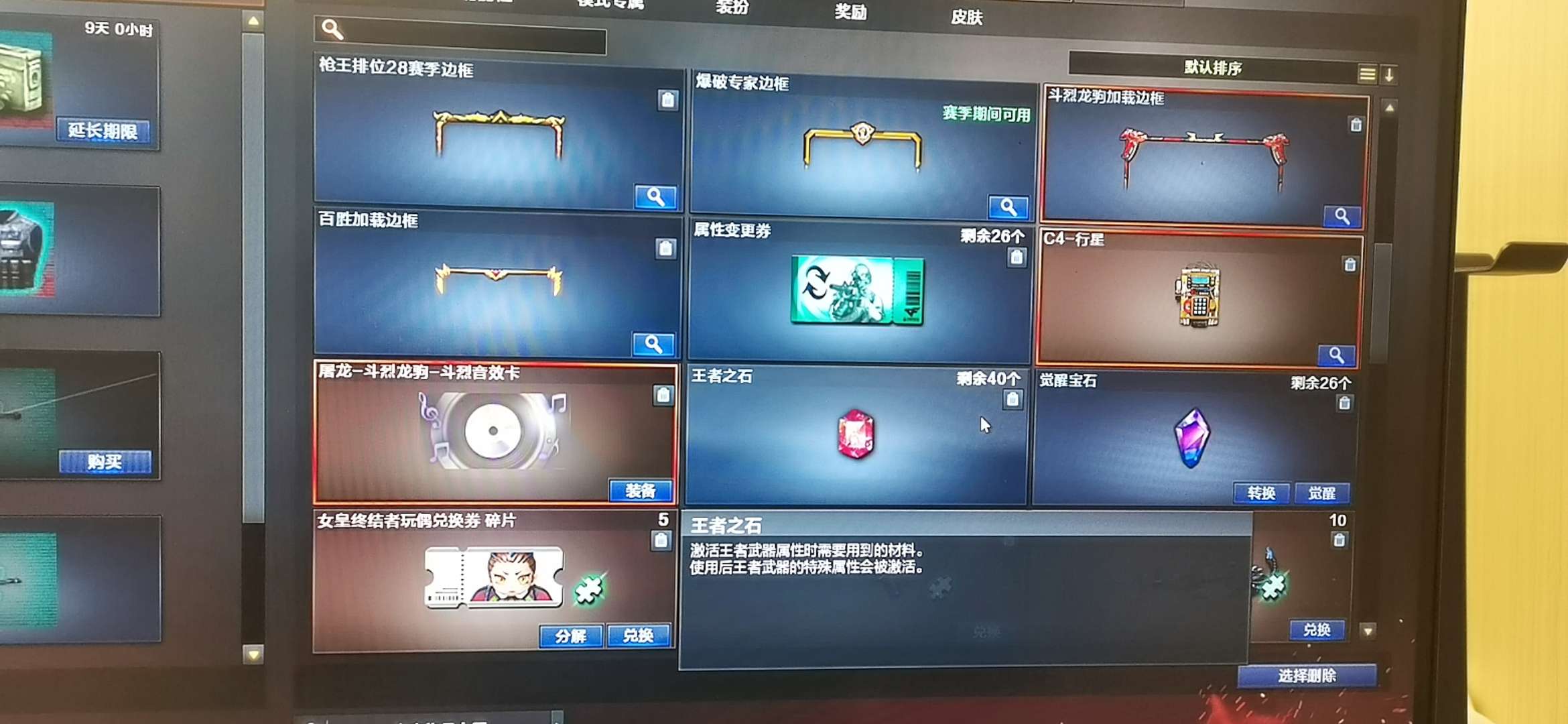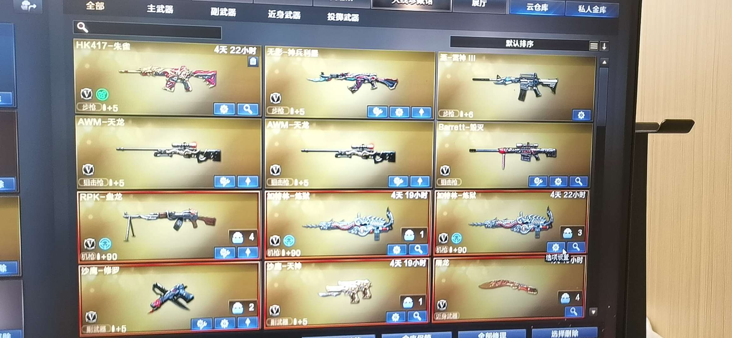 天龙两把,毁灭,沙鹰修罗, 雷霆之峰,盘龙,屠龙斗烈龙驹,无影神兵利器,麒麟刺,王者之灵,炫金修罗,雷霆手雷一套,葵。屠龙斗猎龙驹的消音卡