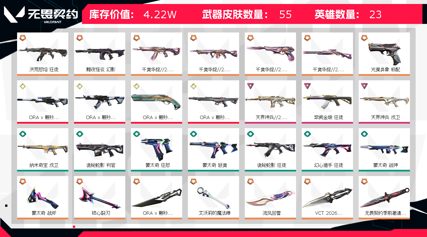 首页 > 租号大厅 > 无畏契约-wegame > wegame/wegame > VCT26篆刀 怜悯之刃 魔法棒 莲花2.0套 颗秒套 流脓紫金威龙ak 古神天界幻影 天界戍卫