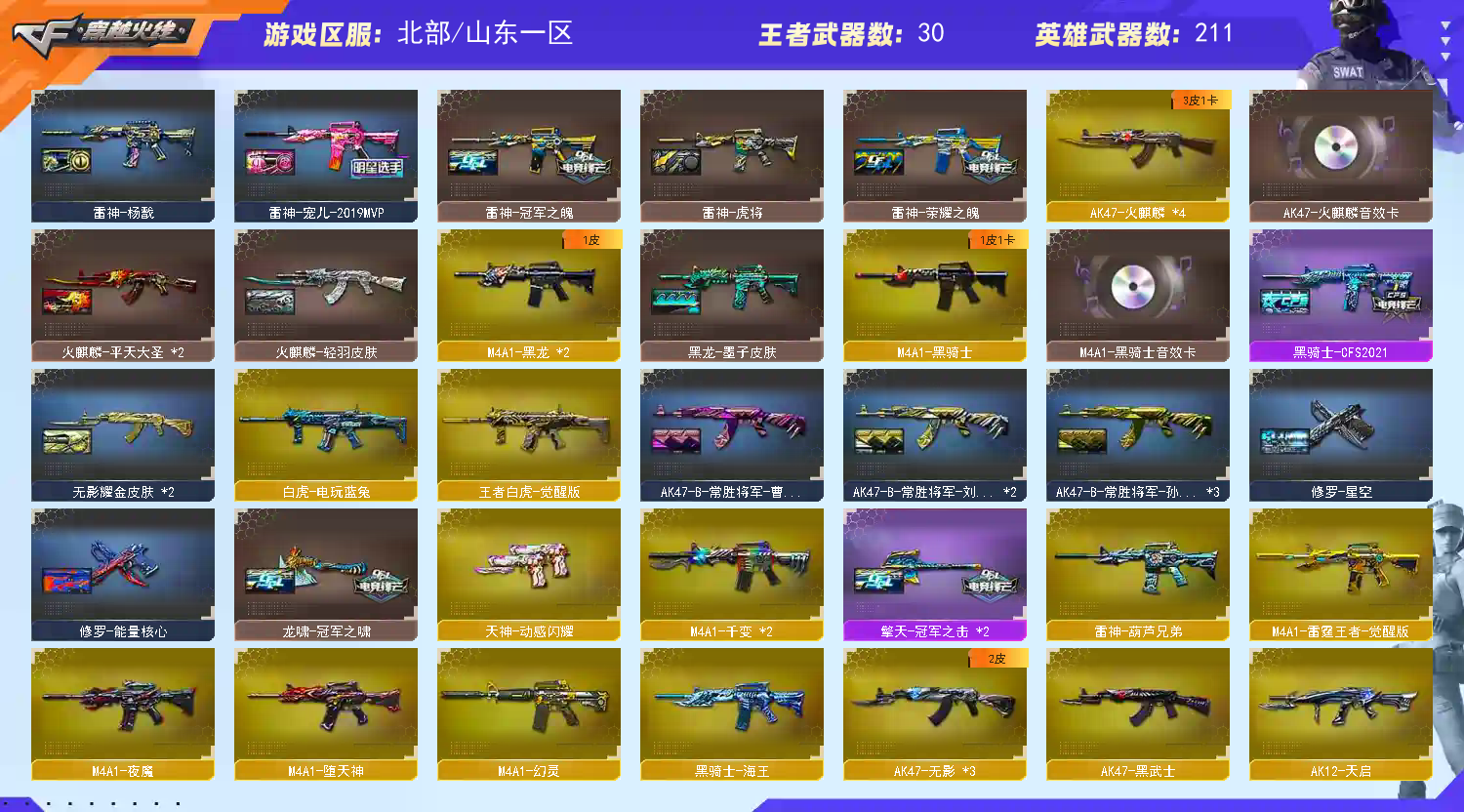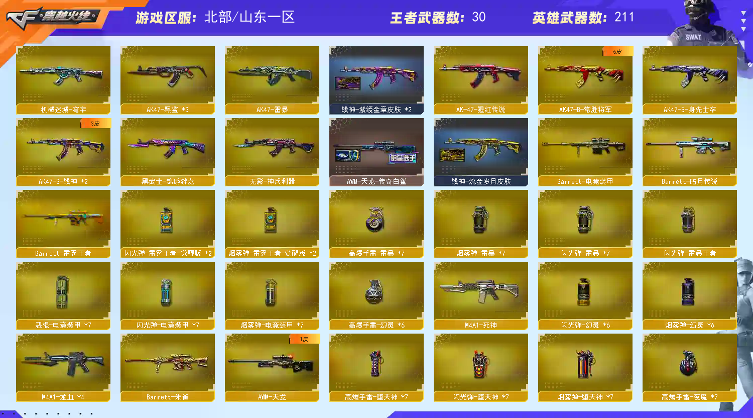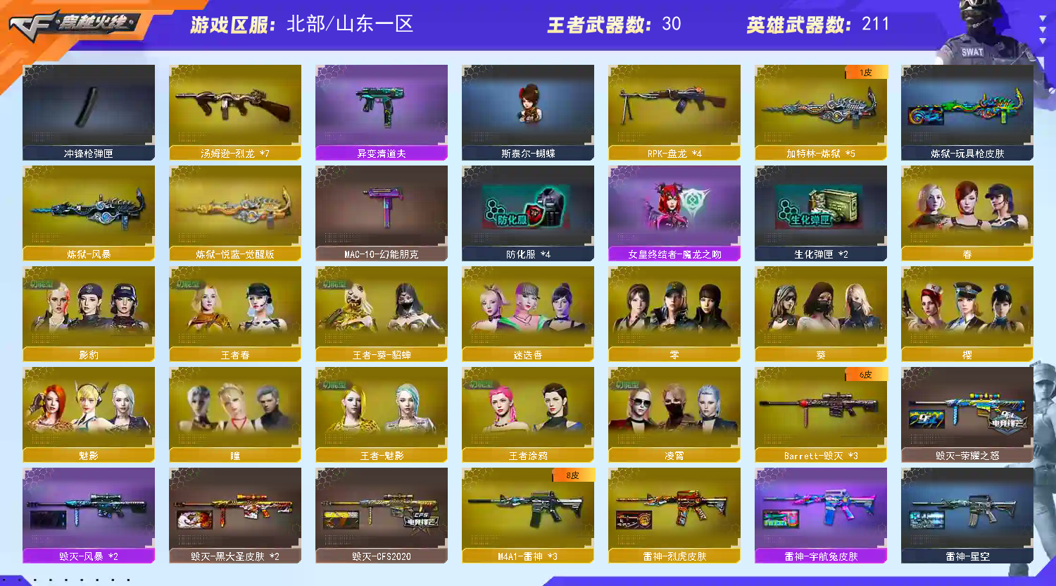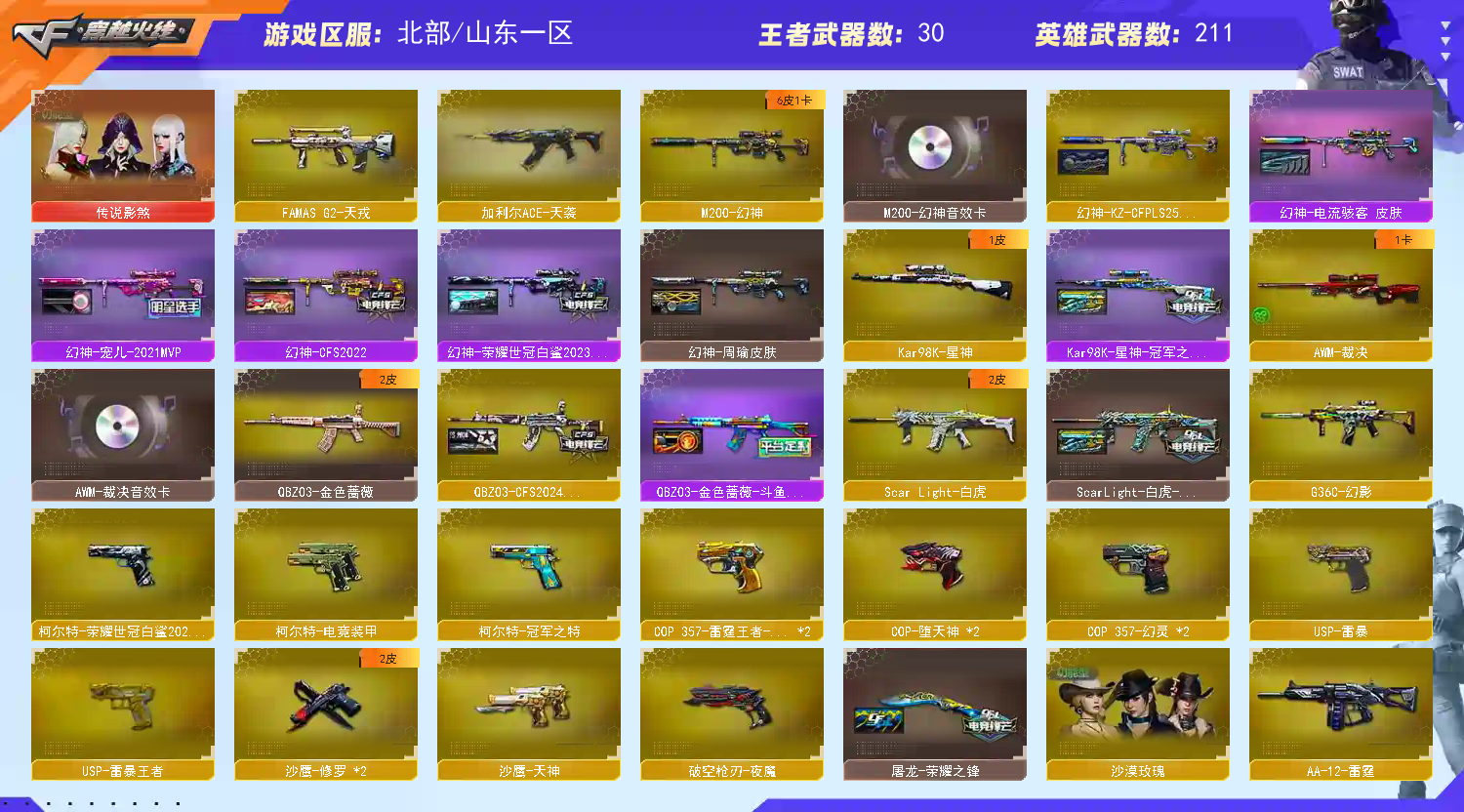 该账号已经过虚拟财产认定,若使用科技和鼠标宏等特殊外设导致账号出现问题,必追究法律责任!祝老板玩的愉快;USP-雷暴,USP-雷暴王者,柯尔特-荣耀世冠白鲨2023,柯尔特-冠军之特,沙漠玫瑰,传说影煞,RPK-盘龙,