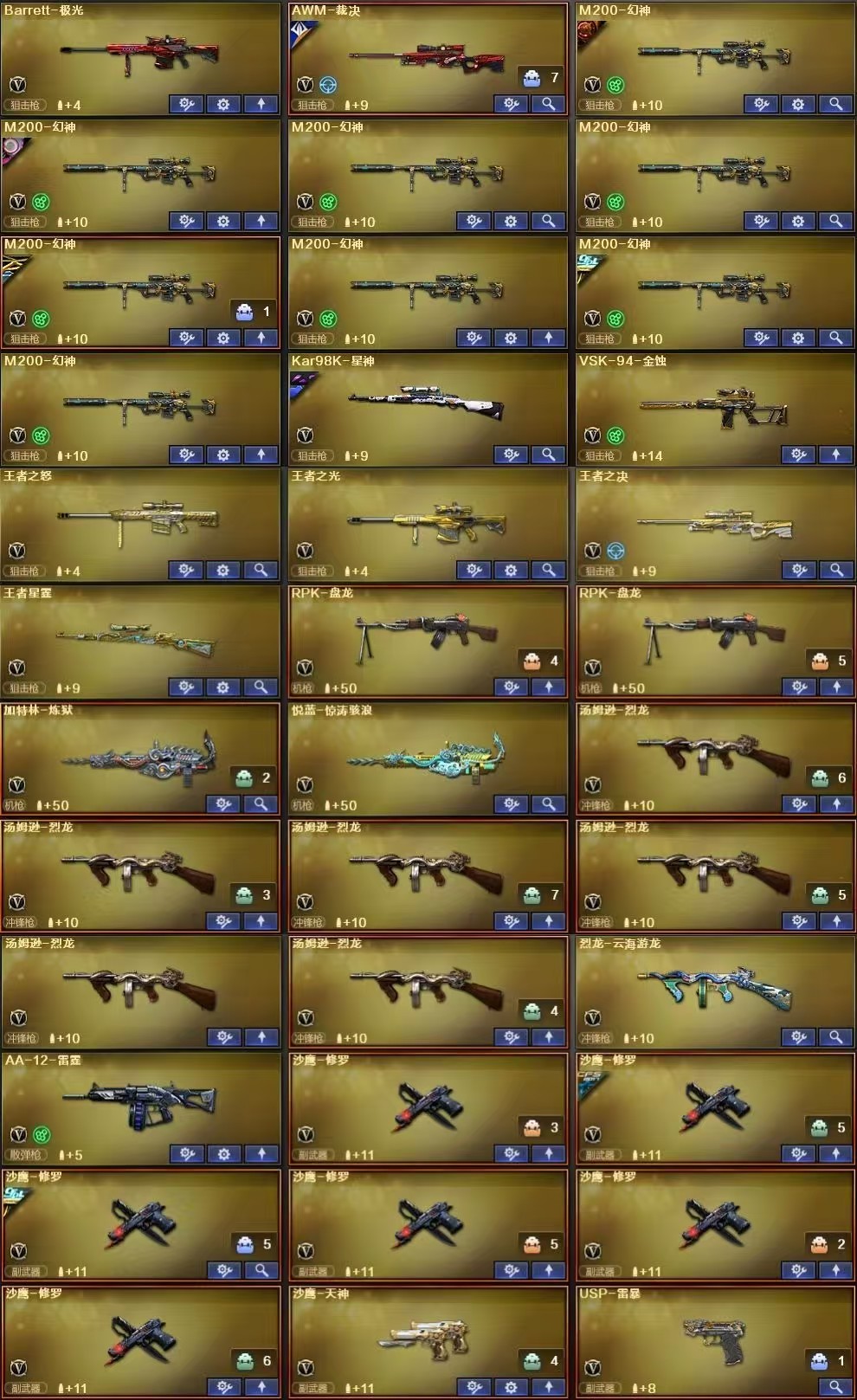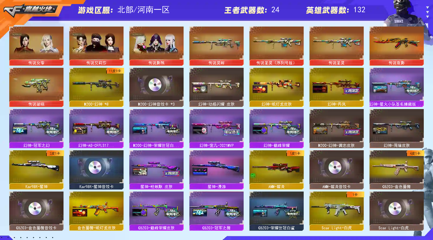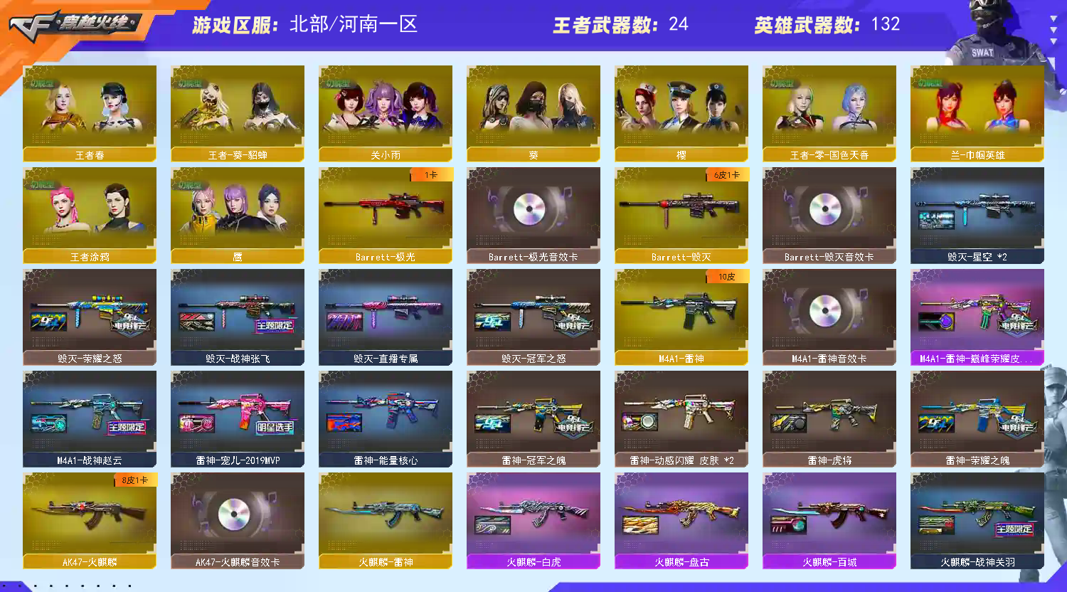 【Lv.102 荣耀元帅】VIP6 传说夜影/传说圣灵(序列号版)/传说圣灵/传说灵眸/传说破晓/幻神动感闪耀 /幻神纸灯龙/幻神黄忠/幻神世冠白鲨/幻神宠儿/幻神星火战队/幻神冠军之幻/幻神巅峰荣耀/幻神周瑜/幻神AG/幻神丹凤/传说艾莉莎 传说影煞 传说女帝 鹰/_樱/司雨/关小雨/雨墨/M200-幻神(8)/Barrett-毁灭/Barrett-极光/barrett-金色蔷薇/王者之怒-觉醒版/雷暴套装/云龙套装/M200-幻神-动感闪耀音效/M4A1-雷神-动感闪耀音效/屠龙-动感闪耀 音效卡/天神-动感闪耀 音效卡/AWM-裁决音效卡/Barrett-极光音效卡/Kar98K-星神音效卡/M200-幻神音效卡/M4A1-黑骑士音效卡/QBZ03-金色蔷薇音效卡/Scar Light-白虎音效卡/火麒麟音效卡/毁灭音效卡/雷神音效卡 【重要套装】雷暴套装/云龙套装 【重要角色】传说艾莉莎/传说影煞/传说女帝/鹰/_樱/司雨/关小雨/雨墨/_葵/隼/雨棠/兰-巾帼英雄/王者沙漠玫瑰/王者涂鸦/王者春/王者-零-国色天香/王者-葵-貂蝉/乔伊教练/女主播/新海豹突击队/职业选手/灵狐者-职业经理/铁骑荣耀/女战神/云海玲珑 【传说武器】传说夜影/传说圣灵(序列号版)/传说圣灵/传说灵眸/传说破晓 【英雄武器】_M200-幻神(8)/Barrett-毁灭/Barrett-极光/barrett-金色蔷薇/王者之怒-觉醒版/王者之光-觉醒版/Kar98K-星神/AWM-天龙/AWM-裁决/王者之决-觉醒版/M4A1-神工天巧/M4A1-雷神/M4A1-龙血/M4A1-黑骑士(6)/黑骑士-海王/M4A1-猎神/M4A1-玫瑰精灵/M4A1-雷霆王者-觉醒版/王者之魄-觉醒版/王者之武-觉醒版/Scar Light-白虎/白虎-电玩蓝兔/王者白虎-觉醒版/AK12-天启/AK47-火麒麟/无影-神兵利器/AK47-雷暴/AK-47-猩红传说/AK47-B-战神/QBZ03-云龙/QBZ03-天罚/QBZ03-金色蔷薇/王者之心-觉醒版/超新星-悦享-觉醒版/烈火-动感闪耀/9A91-烈火(2)/RPK-盘龙(2)/汤姆逊-烈龙(6)/AA-12-雷霆/加特林-炼狱/悦蓝-惊涛骇浪-觉醒版/COP 357-云龙/COP 357-幻灵/天神-动感闪耀/沙鹰-天神(3)/沙鹰-修罗(6)/柯尔特-冠军之特(2)/柯尔特-电竞装甲/USP-雷暴/USP-神工天巧/云龙扇(2)/麒麟刺/龙啸/王者之啸-觉醒版/擎天/擎天-竞技荣光(2)/屠龙-动感闪耀/屠龙(2)/幻灵之锋/斩神刀-雷暴/唐刀-神工天巧/炽芒蝶刃(3)/手雷-动感闪耀/高爆手雷-云龙(2)/高爆手雷-神工天巧(3)/高爆手雷-幻灵(2)/高爆手雷-雷暴(5)/高爆手雷-竞技荣光/烟雾弹-云龙(2)/烟雾弹-神工天巧(3)/烟雾弹-幻灵(2)/烟雾弹-雷暴(5)/烟雾弹-竞技荣光/烟雾弹-电竞装甲(2)/恶棍-电竞装甲/闪光弹-云龙(2)/闪光弹-神工天巧(3)/闪光弹-幻灵/闪光弹-雷暴(5)/闪光弹-竞技荣光/闪光弹-电竞装甲/黑武士-锦绣游龙/G36C-幻影/VSK-94-金蚀/烈龙-云海游龙/龙啸-烈火龙威/擎天-云海游龙/手雷-云海游龙 【王者武器】王者霜心/王者星霆/王者之魄闪光弹(4)/王者之魄高爆手雷(2)/王者之魄烟雾弹(2) 【小人枪】火麒麟-绝迹/M4A1-雷神-精英刀锋/火麒麟-灵狐/巴雷特-零-水下丽影/炼狱-迷你小钢/斯泰尔-蝴蝶(2)/MK5-炽火炎龙(2)/斯泰尔-枪娘暗刃/M37-葵/COP-旗袍/COP-白鲨/USP-嘉年华柯基/夺魂/迷你火种/迷你曼提柯尔/黄金迷你深渊冰龙/迷你深渊冰龙/萌萌海滩皮球汪/迷你牛牛(3)/迷你波特博士/迷你裂空之翼(2)/冰火魔兽/灵狐娃娃手雷/生化手雷-机甲核心 【其他重要武器】炫金武士/炫金黑龙(3)/炫金骑士/炫金无影/超新星-热带奇洋/爆炎激光-超越MAX/集束激光-超越MAX(4)/火麒麟-暗月/M4A1-十二生肖·龙-雷神/机甲撕裂者III(4)/激光毁灭者III-白马银枪/冰龙粉碎者-白马银枪/激光毁灭者III(4)/HK417-赤血龙魂/AK47-十年火线/AK47-齐天大圣/AK47-破空冰刃(2)/AK47-苍龙(2)/M4CQBR-AP-孔明(2)/M4A1-破空冰刃/M4A1-C-海浪(2)/AK47-大帝林肯/M4A1枪王排位II/AK-103-火线13周年/QBZ03-麟龙/AK47-朋克/AK47-雷蛇(2)/M4A1-樱/M4A1-紫狱(2)/AK47-狂欢-CFS/G3A3-SS-枪王排位(2)/AK47-万圣节2021/XM8-炫彩/金色小号/M4A1-秘银赤龙(2)/AK47-烛龙/M4A1-XS-翔龙(2)/M14EBR-炎龙/M14EBR-情人节2020/M4A1-战龙/AK-12-恶棍/AK103-神秘黑洞(2)/M4A1-樱落/百城AK47/M4A1-S-火种/百城M4A1/M4A1-圣诞2021/M4A1-紫炎/M4A1-S-能量核心/AWM-Pink(3)/Barrett-炎龙(2)/AWM-蓝水晶/AWM-涂鸦/M200-情人节2019/M200-落樱/AWM-2018圣诞/双面神/AWM-A-圣诞2021/AWM-A枪王排位II(2)/M200-大黄蜂(2)/M200-庆典-CFS 2021(2)/M200-WeGame/Barrett-耀龙/M200-涂鸦/凤凰之力/M200-神秘黑洞/Barrett-怒火大圣/98K-炫彩/M200-青花瓷/破天狂龙/Barrett-赤龙/98K-火线13周年/AWM-恶棍/黄金AWM/雷蛇AWM/百城AWM/M200-萌杀(2)/AWM-深海猎手/Barrett-苍龙/蓝色魅影/M200-青帝/AWM-万圣节刀锋/巨龙咆哮Ⅲ(3)/KAC-圣炎切割者III(3)/末日裁决者/KAC-小动物/KAC-情人节2021/KAC-赤烛/阿梅利轻机枪-暗夜风暴/火狱乱世-超越Max/CPW-动力-潘多拉/异变清道夫/P90-炫彩/斯泰尔-巧克力/MK5-枪王排位/斯泰尔-CFS2017纪念版/AA12-擎天柱(3)/征服者-毁灭之王 [Lv Max]/试炼破坏者III(4)/神圣爆裂者(5)/神圣爆裂者-末日/AA-12-圣龙/Spas-12-幻能朋克/SPAS-12-雷电核心(2)/阐释者III/惩戒者III/COP 357--绚樱/沙鹰-青龙(2)/愤怒公牛左轮-枪王排位/凤凰之火/愤怒公牛左轮-丹龙/COP-金蝉子-枪王排位(4)/沙鹰-枪王排位(4)/USP-黑大圣(2)/COP-青帝/新USP-枪王排位奖励(4)/新USP-怒火大圣/Cop357-赤龙/MAC-10-幻能朋克(2)/幻影Anaconda-枪王排位/沙鹰-雷蛇/柯尔特-百城/COP357-绚樱-圣诞/COP357-十二生肖·羊/COP-机甲刑天/迷彩沙鹰-70KG/龙啸-热带奇洋/擎天-惨叫迹/金刚伞-电玩红兔/虹光鹰爪-枪王排位/尼泊尔军刀-战龙(3)/Knife-冠军之刃(2)/黄金猫猫手套-白鲨/蝴蝶刀-枪王排位/幻影双斧-枪王排位(2)/军用铁锹-飞龙在天/军用铁