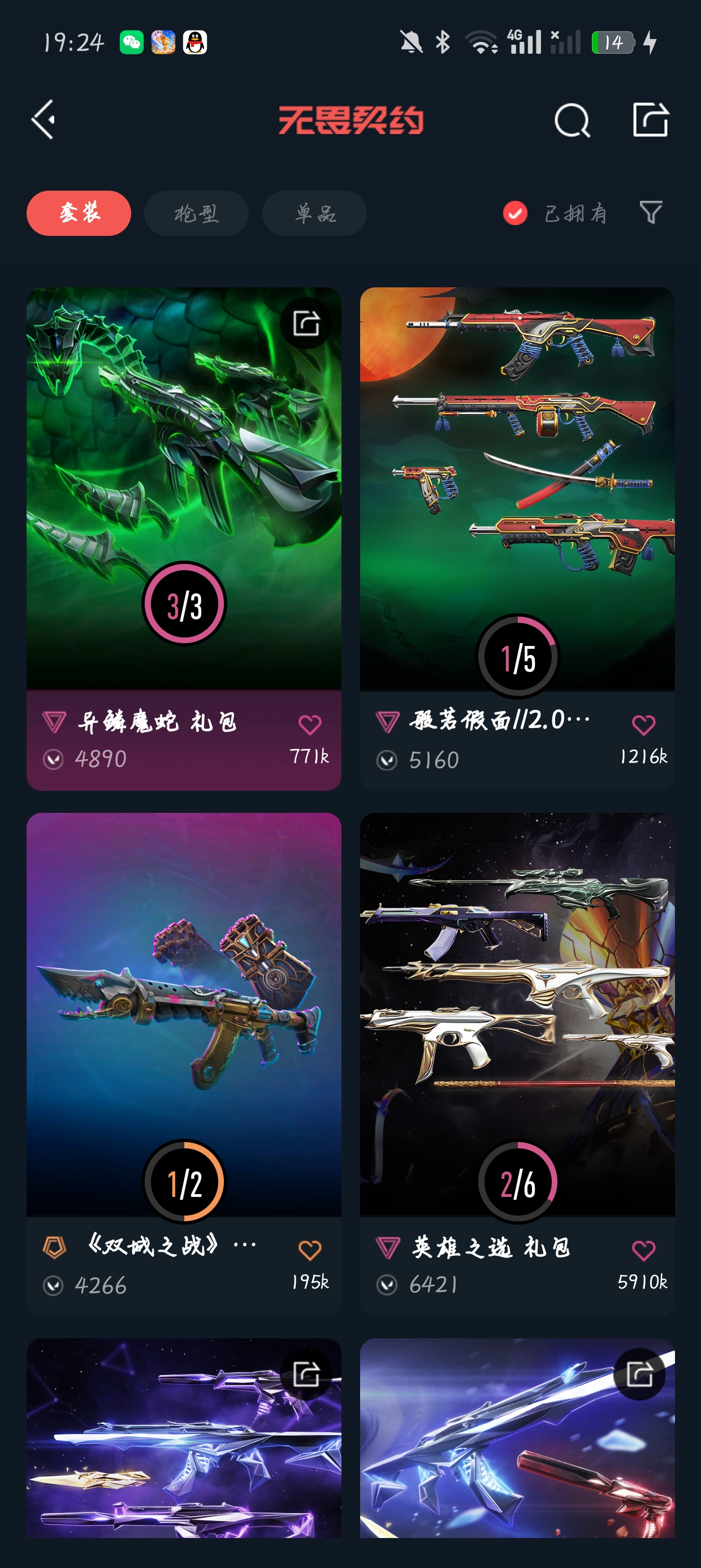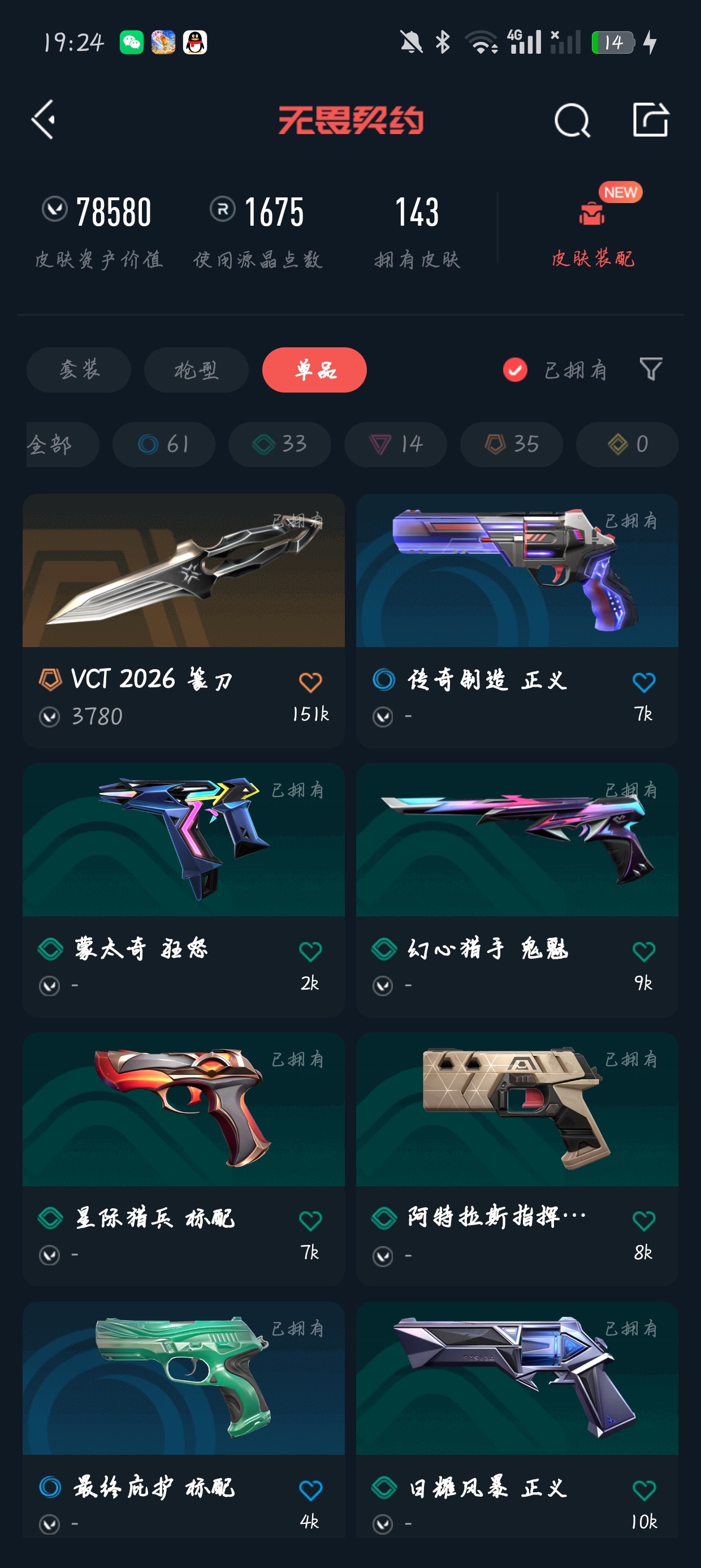 Q区 143个皮肤 VCT2026篆刀/紫金爪刀/显卡爪刀/弃王大狙/混沌ak/蛇年m4/西部正义