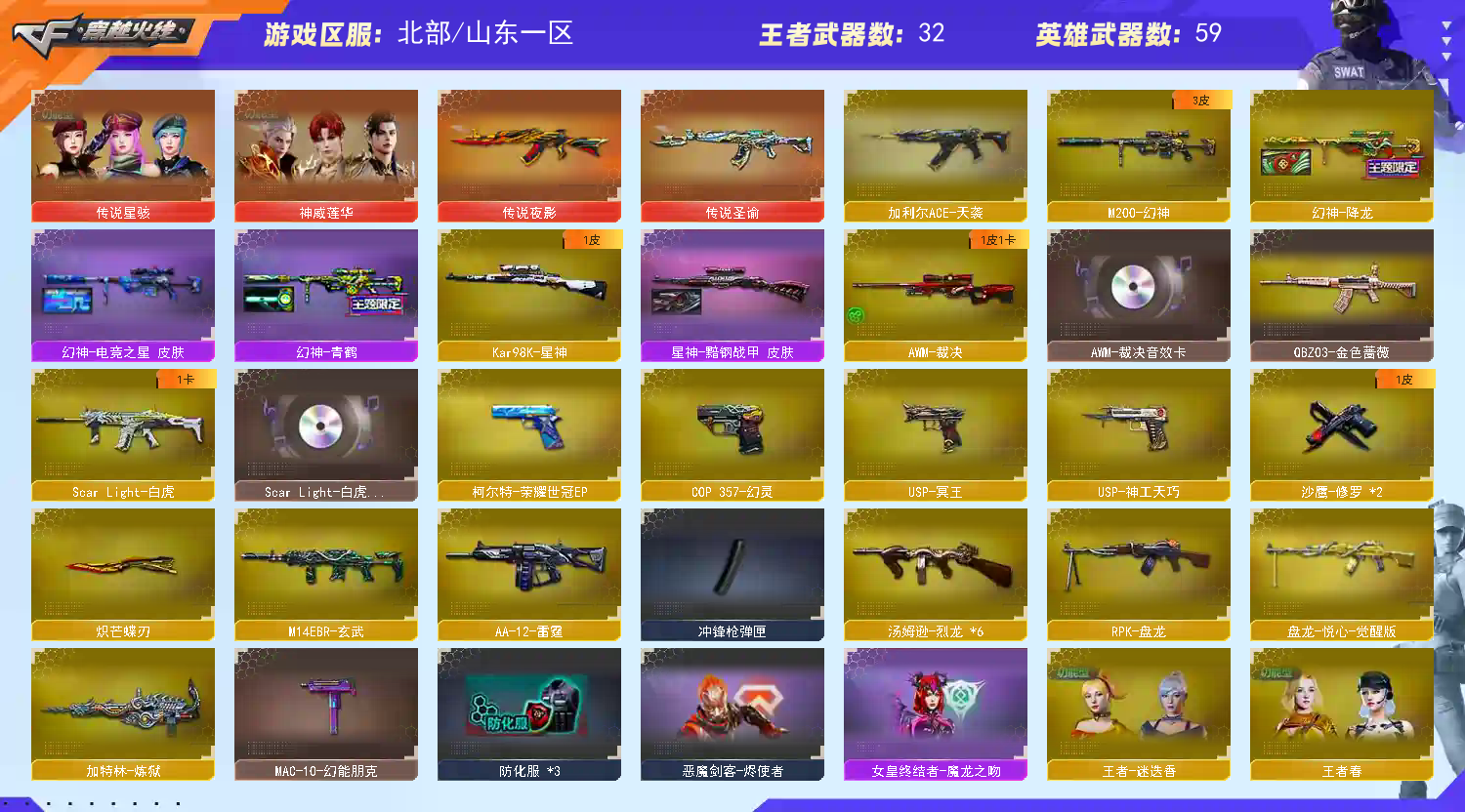 传说神威莲花|幻神|98k 星神|白虎|音效卡|ep冠军|六烈龙|炽茫蝶刃|幻面令狐|全英雄级|;炽芒蝶刃,传说星骇,RPK-盘龙,QBZ03-金色蔷薇,M200-幻神,Scar Light-白虎,加利尔ACE-天袭,