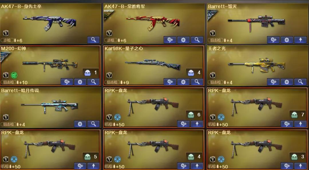 生化爆破套,生化:神威莲花四防,毒蝰术士,隼,蝴蝶六列,炼狱狮子六盘 爆破:智,王者魅影,幻神,王者usp雷暴,cop雷霆,白虎,雷神,加利尔天袭,g36c幻影,以及各种喷子七套量子之心;USP-雷暴王者,炽芒蝶刃,隼,RPK-盘龙,QBZ03-金色蔷薇,G36C-幻影,M200-幻神,