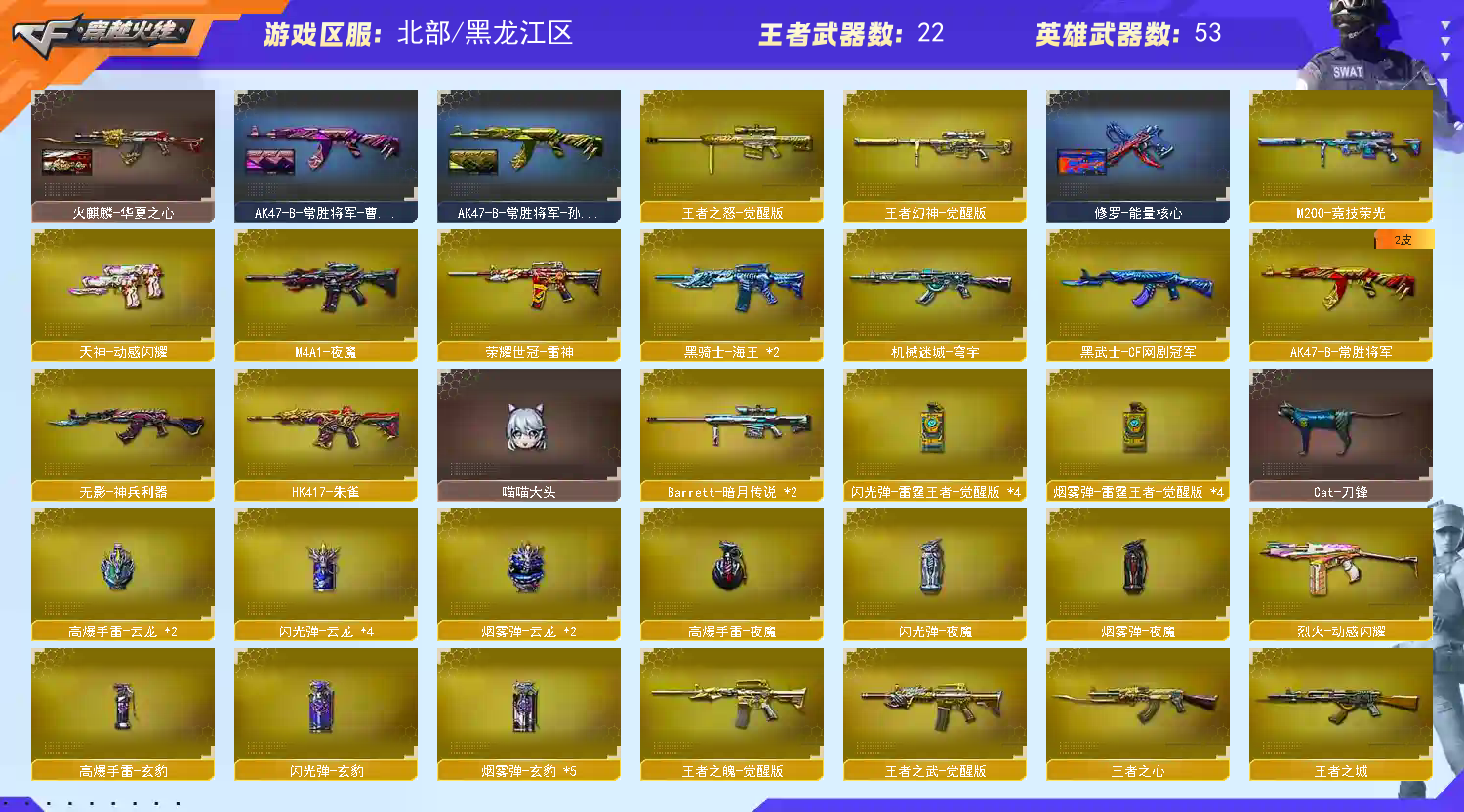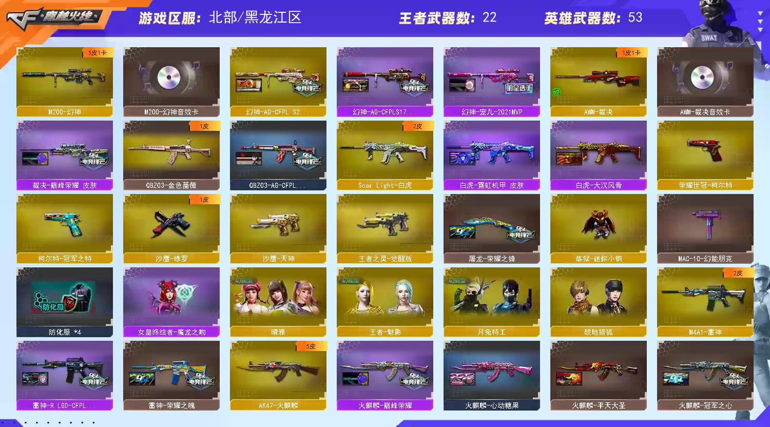 喜欢多多收藏 开挂必追责;荣耀世冠-柯尔特,柯尔特-冠军之特,晴雅,QBZ03-金色蔷薇,M200-幻神,Scar Light-白虎,