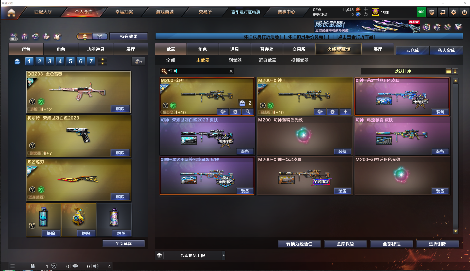 76V 爆破生化号////狙击:幻神星火小队、荣耀世冠EP、世冠白鲨等* 星神璀璨* 裁决荣耀巅峰+音效卡* 毁灭SV、cfs2020+音效卡////步枪:QBZ传奇宠儿、冠军之薇、世冠白鲨* G36-C幻影* 白虎白鲨皮肤* 雷蛇荣耀皮肤////副武器:4个世冠白鲨柯尔特*COP云龙////:蝴蝶刀世冠皮 *屠龙星火、荣耀*龙啸荣耀;柯尔特-荣耀世冠白鲨2023,炽芒蝶刃,晴雅,RPK-盘龙,QBZ03-金色蔷薇,G36C-幻影,M200-幻神,