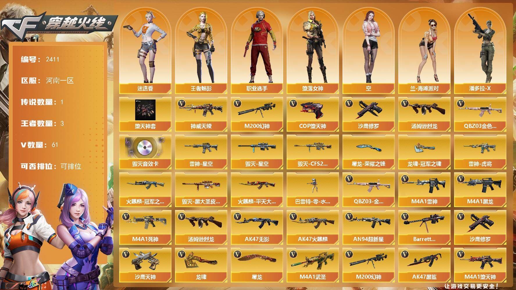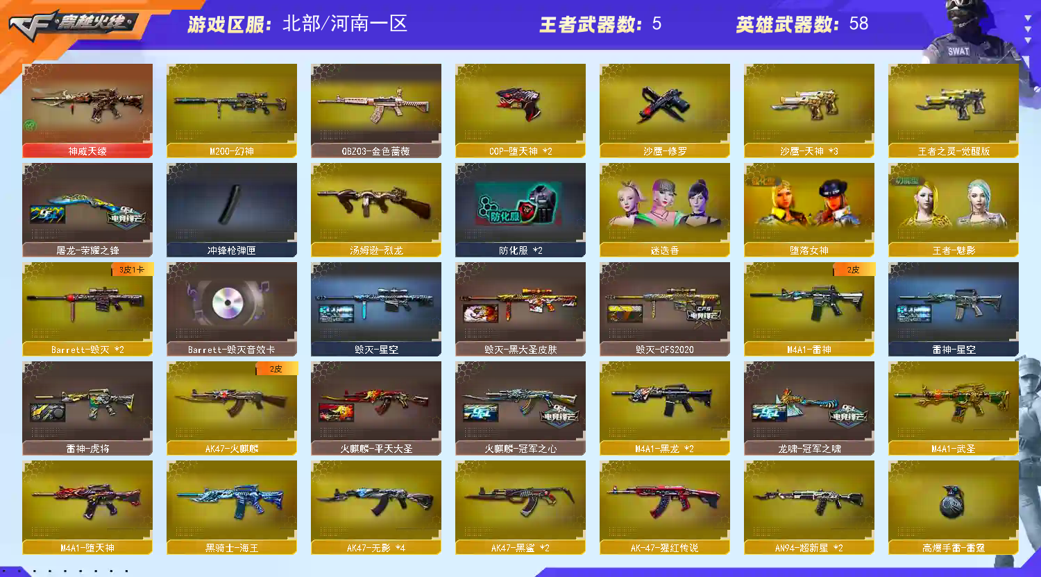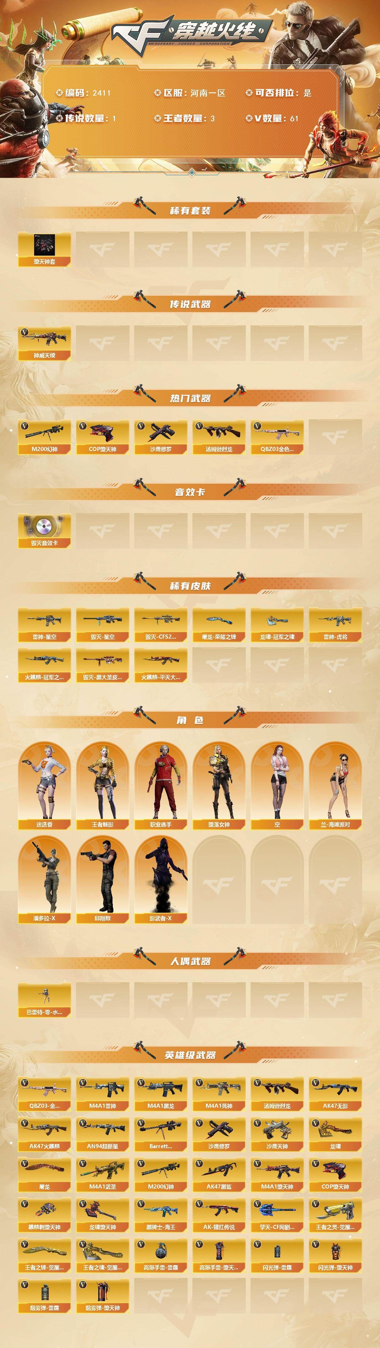 【传说武器】:神威天绫【热门武器】:QBZ03-金色蔷薇,M200-幻神,汤姆逊-烈龙,COP-堕天神*2,沙鹰-修罗【稀有套装】:堕天神套【音效卡】:Barrett-毁灭音效卡【皮肤】:雷神-星空,雷神-虎将,火麒麟-冠军之心,火麒麟-平天大圣,毁灭-星空,毁灭-CFS2020,毁灭-黑大圣皮肤,屠龙-荣耀之锋,龙啸-冠军之啸【角色】:迷迭香,四防王者-魅影,堕落女神,空,兰-海滩派对,潘多拉-X,邱刚敖,影武者-X,职业选手【人偶武器】:巴雷特-零-水下丽影【英雄级武器】:AK47-火麒麟,M4A1-黑龙*2,M4A1-雷神,AK47-无影*4,M4A1-死神,AN94-超新星*2,M4A1-武圣,AK47-黑鲨*2,M4A1-堕天神,QBZ03-金色蔷薇,AK-47-猩红传说,黑骑士-海王,Barrett-毁灭*2,M200-幻神,汤姆逊-烈龙,沙鹰-修罗,沙鹰-天神*3,COP-堕天神*2,王者之灵-觉醒版,屠龙,龙啸,麒麟刺-堕天神,龙啸-堕天神*2,擎天-CF网剧冠军,王者之锋-觉醒版,王者之啸-觉醒版,高爆手雷-雷霆,高爆手雷-堕天神*6,闪光弹-雷霆,闪光弹-堕天神*6,烟雾弹-雷霆,烟雾弹-堕天神*6【道具】:炫彩背包,超级背包,绿色巨人,灵魂忍者,迷雾幽灵,夺命之镰,防化服*2,防弹头盔*2,防弹衣*2,C4工具钳*2,手雷包*2【特殊枪械】:1烈龙,;QBZ03-金色蔷薇,M200-幻神,