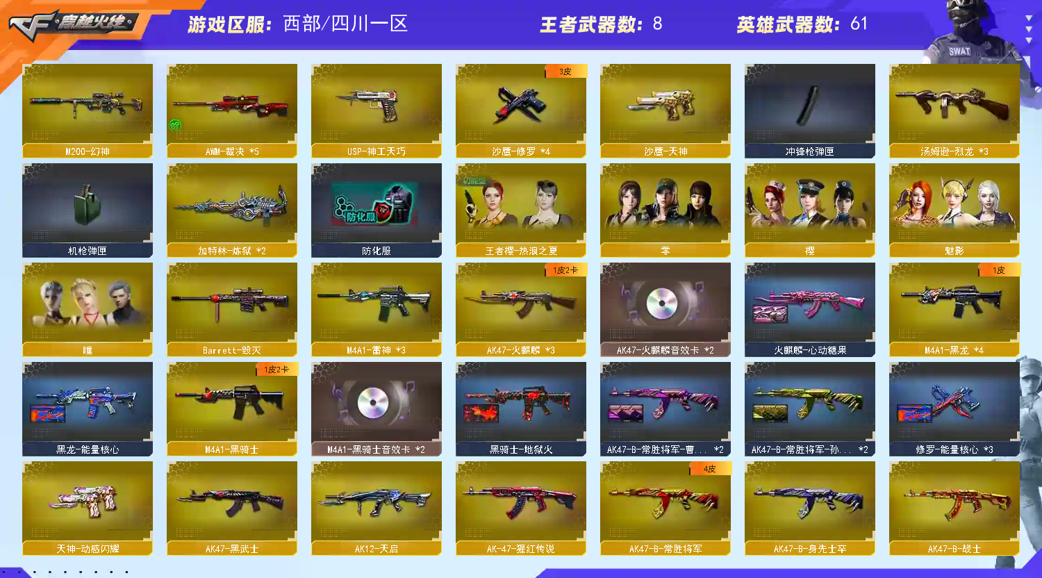 【热门武器】:HK417-朱雀,M200-幻神,死亡之眼,M4A1-黑骑士,汤姆逊-烈龙*3,加特林-炼狱,羊驼玩偶,沙鹰-修罗*3【王者炫金武器】:王者之戮,王者之影,王者之灵,炫金骑士,炫金雷神,炫金毁灭【音效卡】:AK47-火麒麟音效卡*2,M4A1-黑骑士音效卡*2【皮肤】:火麒麟-心动糖果,M4A1-千变-孔明皮肤,黑龙-能量核心,黑骑士-地狱火,无影耀金皮肤*2,战神-粉色甜心皮肤*2,战神-紫绶金章皮肤*2,战神-流金岁月皮肤,AK47-B-常胜将军-曹操*2,AK47-B-常胜将军-孙权*2,修罗-能量核心*3,麒麟刺-甜蜜糖果 皮肤【角色】:零,樱,瞳,魅影,王者樱-热浪之夏,乔伊教练,修道士,芳心审判者,风暴女,嘉年华灵狐,兰-海滩派对,零-水下丽影,灵狐者-黄金海岸,龙儿,潜龙队-X,青霞仙子,斯沃特-X,影武者-X【人偶武器】:天龙-曼陀罗,火麒麟-灵狐,AWM-灵狐-15周年嘉年华,海滩汪汪-巴雷特,M37-葵,COP-旗袍,迷你深渊冰龙*2,迷你牛魔王,迷你生化手雷,闪光弹-小乔,闪光弹-貂蝉,高爆手雷-大乔,灵狐娃娃手雷【暴走生化】:死亡之眼【英雄级武器】:AK47-火麒麟*2,M4A1-黑龙*3,M4A1-雷神*2,M4A1-黑骑士,AK47-黑武士,AK12-天启,M4A1-龙血*3,HK417-朱雀,无影-神兵利器,M4A1-猎神,9A91-烈火*2,王者之翼-觉醒版,AK-47-猩红传说,AK47-B-常胜将军,Barrett-毁灭,AWM-裁决*5,M200-幻神,加特林-炼狱,汤姆逊-烈龙*3,烈龙-悦心-觉醒版,沙鹰-修罗*3,沙鹰-天神,USP-神工天巧,天神-动感闪耀,屠龙*4,龙啸*2,擎天*3,麒麟刺*2,幻灵之锋,王者之锋-觉醒版,高爆手雷-神工天巧,手雷-动感闪耀,闪光弹-神工天巧,烟雾弹-神工天巧【道具】:全能枪王背包,机械魔影背包-红色,超级背包,夺命之镰,防化服,金色流光-枪王排位,星辰流光-枪王排位,枪王排位28赛季金色流光,C4-沙漠,防弹头盔*5,防弹衣*5,C4工具钳*4,手雷包*5【特殊枪械】:1黑骑士,3烈龙,1炼狱,;M200-幻神,