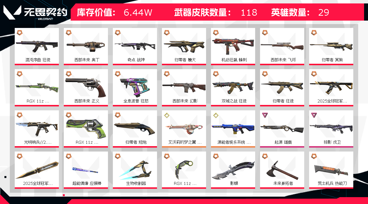 首页 > 租号大厅 > 无畏契约-wegame > wegame/wegame > 掠夺套,电玩幻影,西部套,所有武器的最定级的皮肤都有