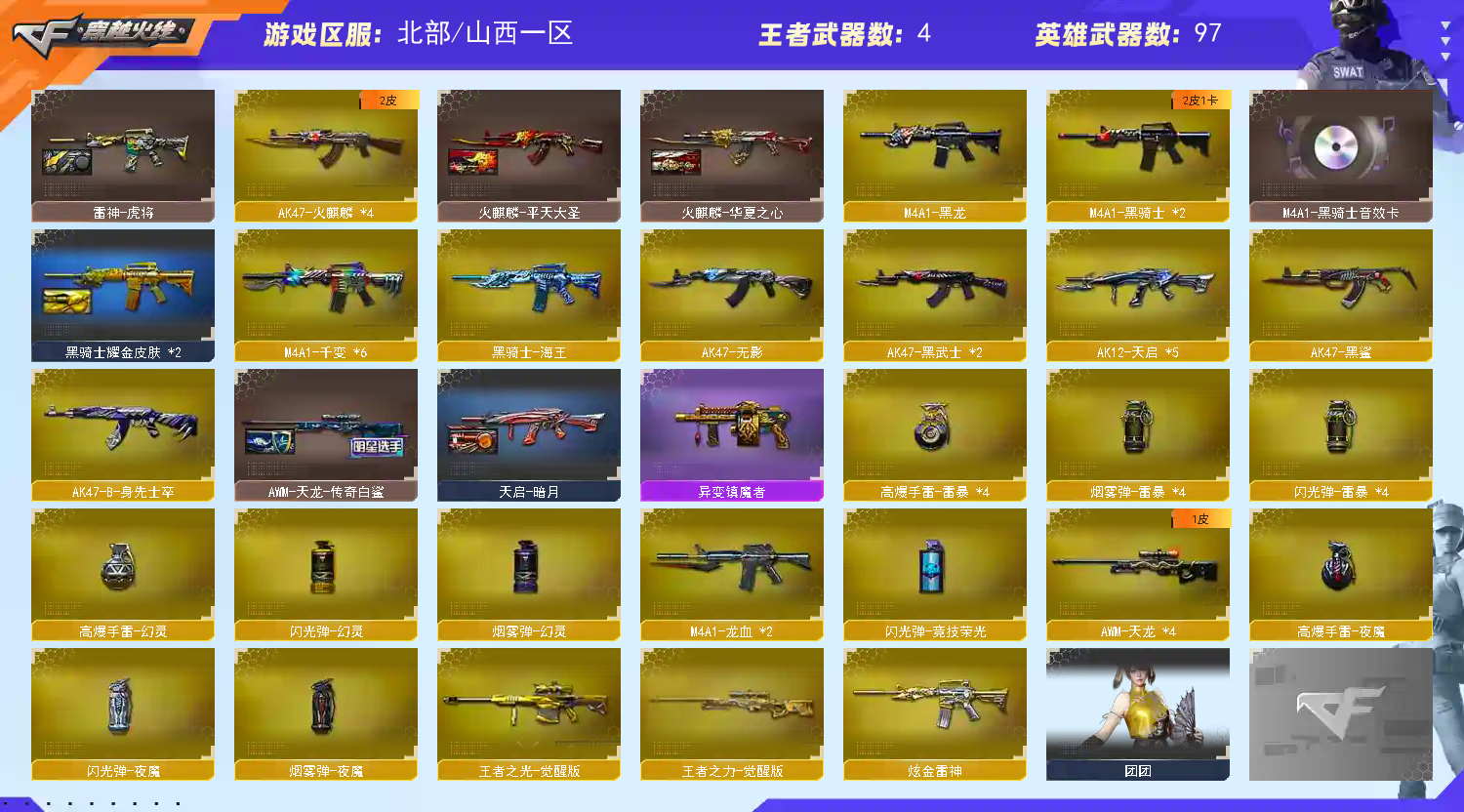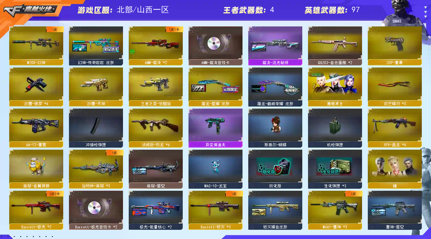【4防毒蝰】❤️3把炽芒蝶刃+炼狱金翼禅狮(赋予)+龙宝斯太尔蝴蝶丨异变清道夫镇魔者❤️极光裁决带卡;USP-雷暴,炽芒蝶刃,RPK-盘龙,QBZ03-金色蔷薇,M200-幻神,