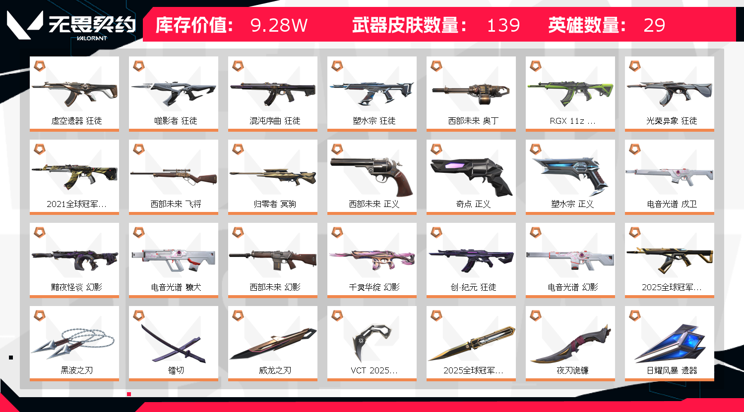 冠军多;西部未来 奥丁,黑波之刃,镭切,威龙之刃,VCT 2025 爪刀,盖亚的复仇 狂徒,虚空遗器 狂徒,