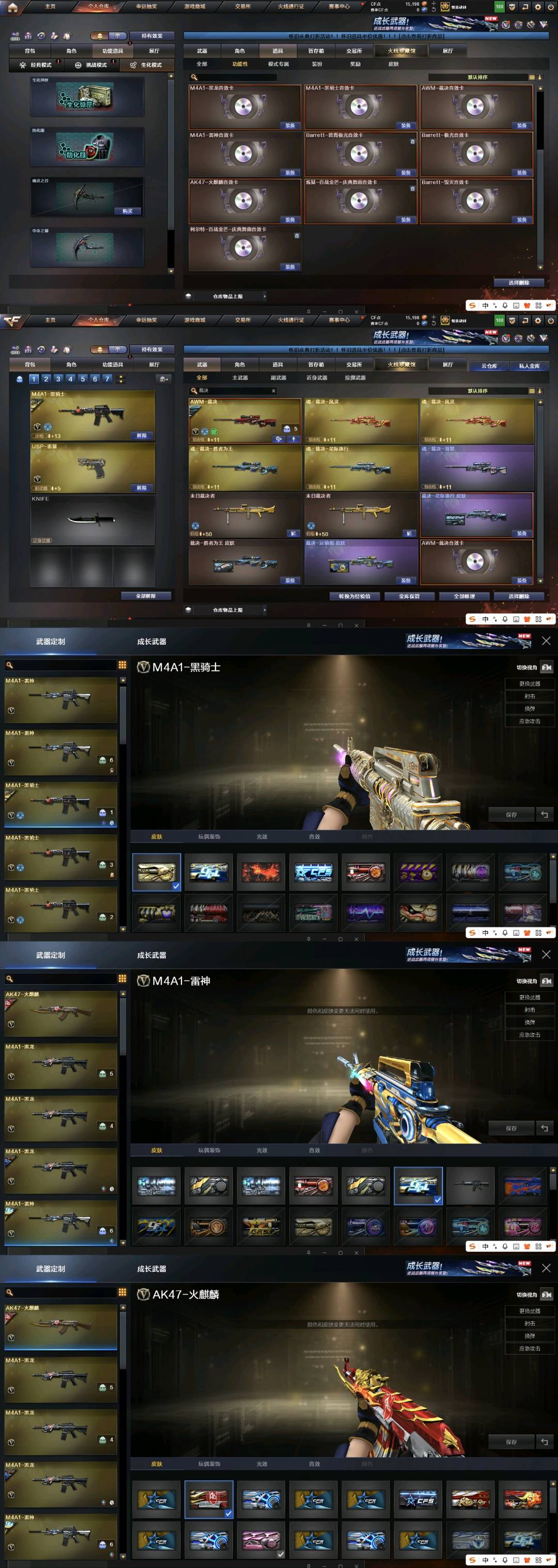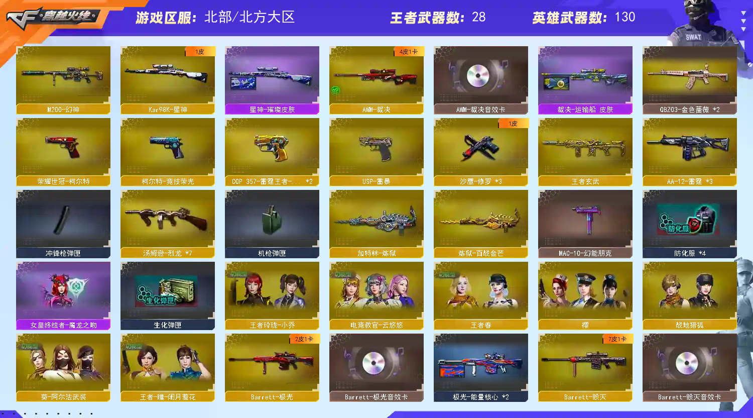 多音效卡雷神,火麒麟,极光,毁灭,裁决这些热门武器都有音效卡,可以看图,租到就是赚到觉得物美价廉物超所值;USP-雷暴,荣耀世冠-柯尔特,电竞教官-云悠悠,QBZ03-金色蔷薇,M200-幻神,Kar98K-星神,