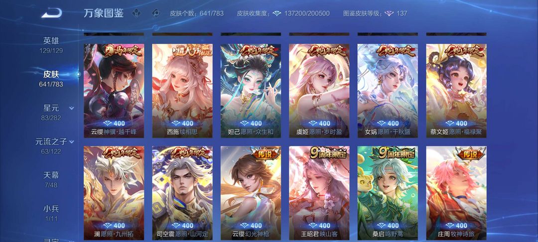 女生号 贵10 多皮肤多传说 别拿那些空号v10来比 要看性价比 貂蝉武则天夏侯惇孙悟空李白鲁班小乔荣耀水晶 妲己九尾无双皮肤 80个传说 473皮肤