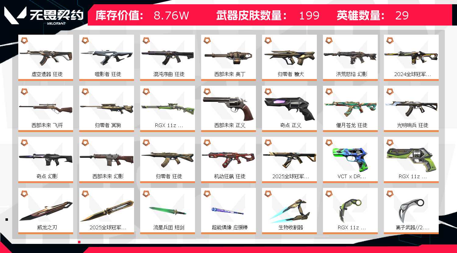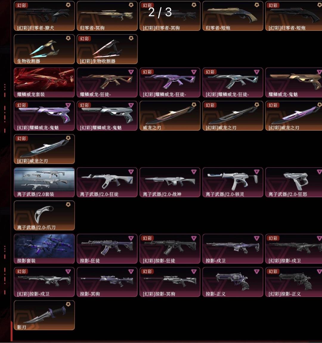 【拥有手枪】VCT-x-DRG-标配,奇点-正义,冰点凝冻-标配,阿特拉斯指挥部-标配,诡秘蛇影-鬼魅,神圣领域-狂怒,荒土机兵-标配,超限闪存-正义,超能偶像-标配,流星兵团-鬼魅,珍珠棘贝-狂怒,钢轨卫士-短炮,钢轨卫士-狂怒,沙尘幻旅-正义,弧光异彩-短炮,瑰梦艺语-鬼魅,光环序列-狂怒,宿怨-鬼魅,火线狂怒,末日之翼-短炮,折光棱晶-标配,星云暗涌-鬼魅,月球哨兵-正义,纳米-正义,逆冲蛮牛-狂怒,浮光跃金-标配,模拟赫兹-鬼魅,聚合之力-狂怒,采蜜小蜂队-鬼魅,纤云弄巧-正义,战术熊与伙伴们-狂怒,纤云弄巧-短炮,战术熊与伙伴们-标配,游戏结束-正义,复古浪潮-正义,深海水族-短炮,光导纤维-鬼魅,光导纤维-标配,萌彩剪影-狂怒,胡桃狂想-鬼魅,彩梦之城-标配,信手涂鸦-鬼魅,