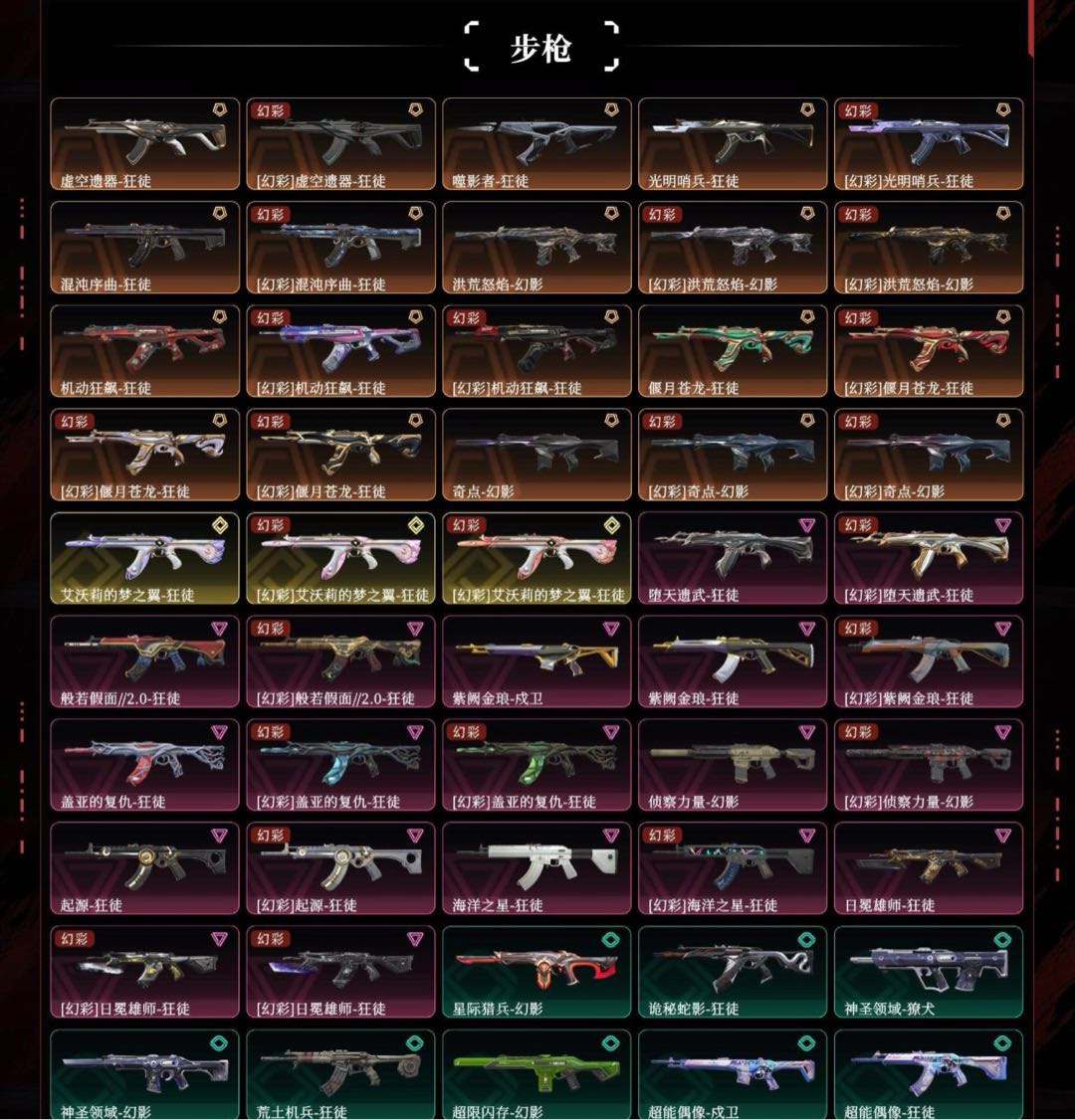 【拥有步枪】虚空遗器-狂徒,噬影者-狂徒,光明哨兵-狂徒,混沌序曲-狂徒,洪荒怒焰-幻影,机动狂飙-狂徒,偃月苍龙-狂徒,奇点-幻影,艾沃莉的梦之翼-狂徒,堕天遗武-狂徒,般若假面//2.0-狂徒,紫阙金琅-戍卫,紫阙金琅-狂徒,盖亚的复仇-狂徒,侦察力量-幻影,起源-狂徒,海洋之星-狂徒,日冕雄师-狂徒,星际猎兵-幻影,诡秘蛇影-狂徒,神圣领域-獠犬,神圣领域-幻影,荒土机兵-狂徒,超限闪存-幻影,超能偶像-戍卫,超能偶像-狂徒,流星兵团-狂徒,珍珠棘贝-幻影,珍珠棘贝-戍卫,钢轨卫士-狂徒,钢轨卫士-戍卫,沙尘幻旅-狂徒,噬源兽防卫工程-幻影,弧光异彩-獠犬,弧光异彩-狂徒,瑰梦艺语-狂徒,光环序列-戍卫,末日之翼-幻影,折光棱晶-戍卫,月球哨兵-戍卫,纳米-幻影,逆冲蛮牛-戍卫,逆冲蛮牛-獠犬,模拟赫兹-獠犬,浮光跃金-戍卫,聚合之力-幻影,采蜜小蜂队-獠犬,战术熊与伙伴们-戍卫,复古浪潮-獠犬,战术小伙伴-獠犬,战术小伙伴-幻影,萌彩剪影-戍卫,胡桃狂想-獠犬,彩梦之城-戍卫,